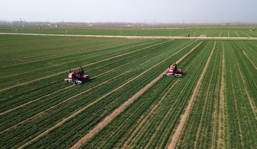 山東省汶上縣,農(nóng)民駕駛農(nóng)機在高標準農(nóng)田里進行小麥春季管護作業(yè)(2024年3月13日攝,無人機照片)。新華社記者 徐速繪 攝