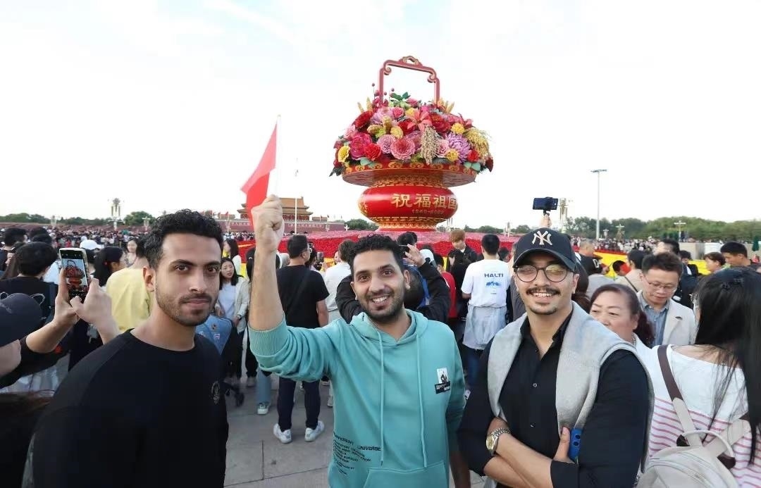 △2023年10月1日,三位來(lái)自阿爾及利亞的游客在北京天安門廣場(chǎng)“祝福祖國(guó)”巨型花籃前留影。