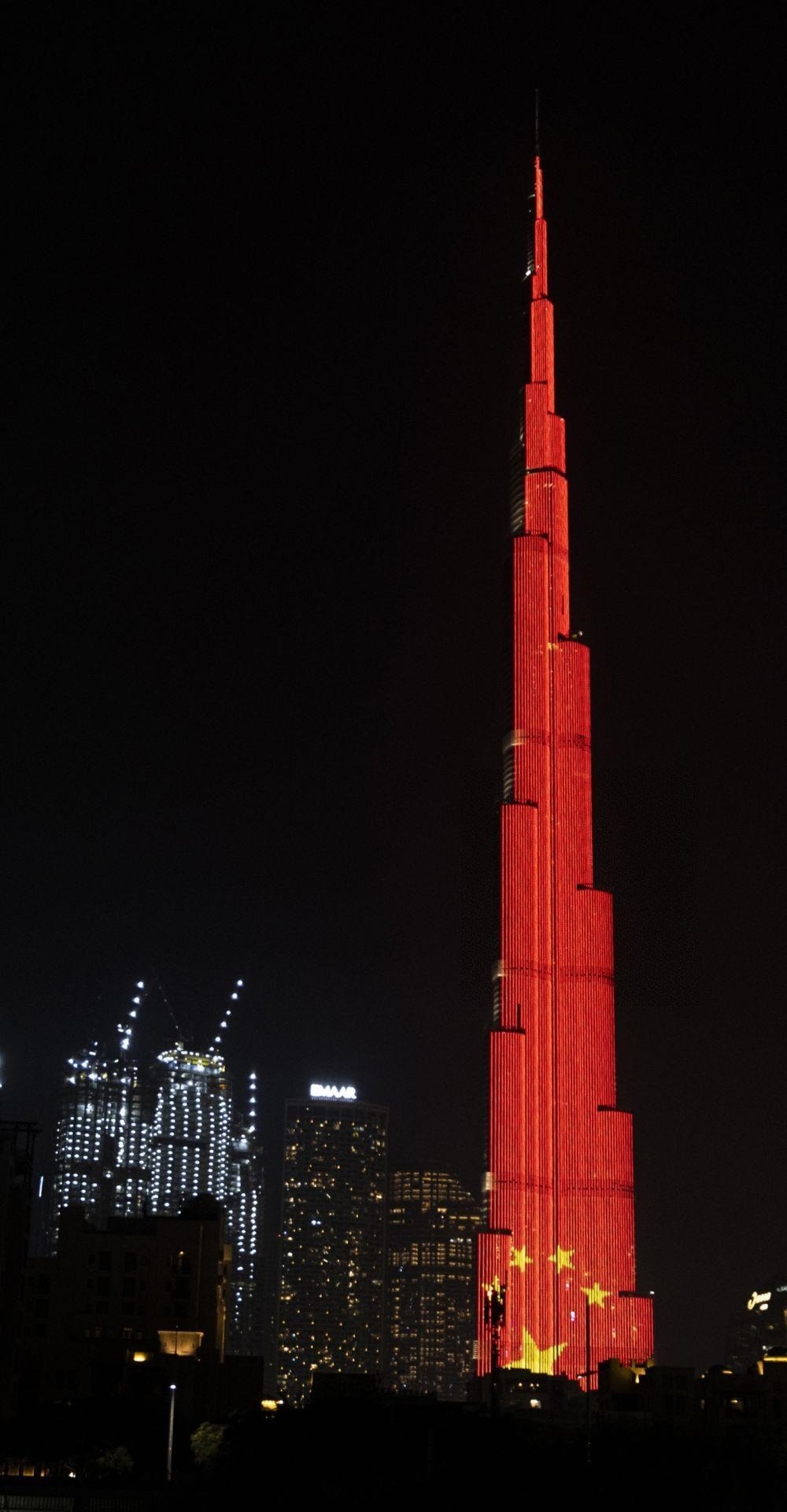 △當(dāng)?shù)貢r(shí)間2020年2月2日,在阿聯(lián)酋迪拜,當(dāng)?shù)氐貥?biāo)建筑物哈利法塔點(diǎn)亮中國(guó)國(guó)旗圖案,為中國(guó)抗擊新冠肺炎疫情加油。