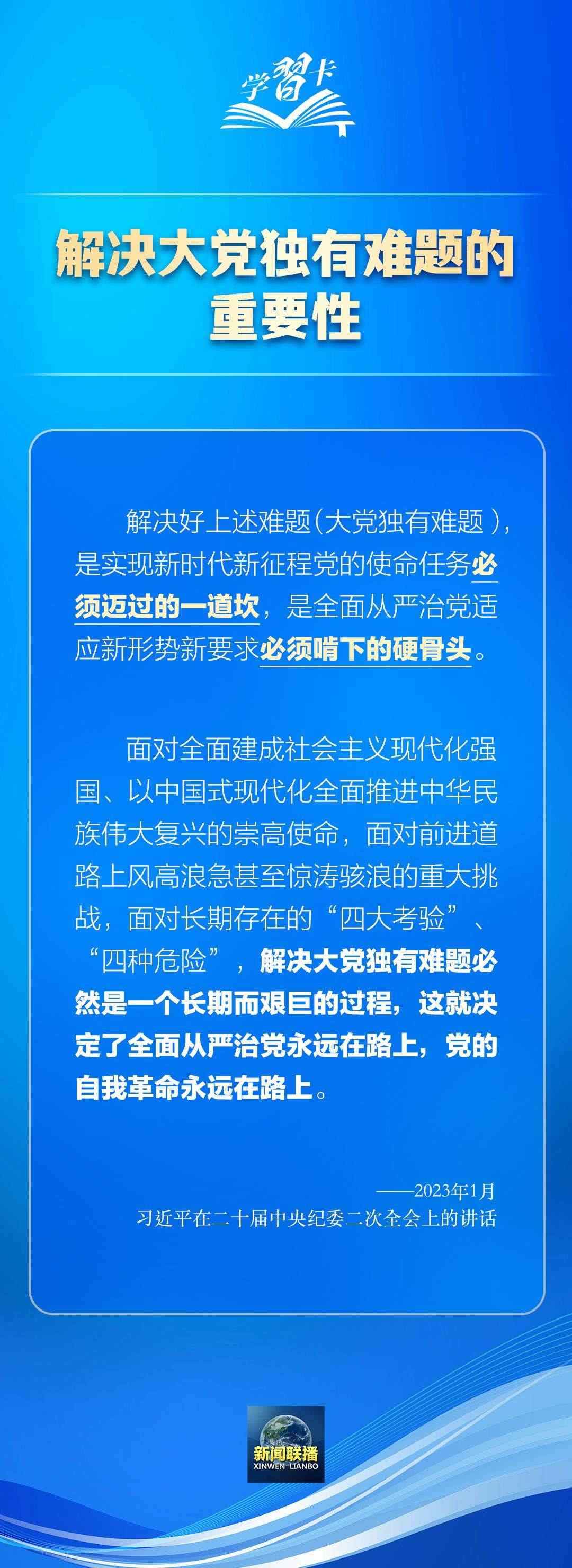 習(xí)近平總書記在不同場合多次強調(diào)全面從嚴(yán)治黨、黨的自我革命的重要性。解決好大黨獨有難題,是實現(xiàn)新時代新征程黨的使命任務(wù)必須邁過的一道坎,是全面從嚴(yán)治黨適應(yīng)新形勢新要求必須啃下的硬骨頭。