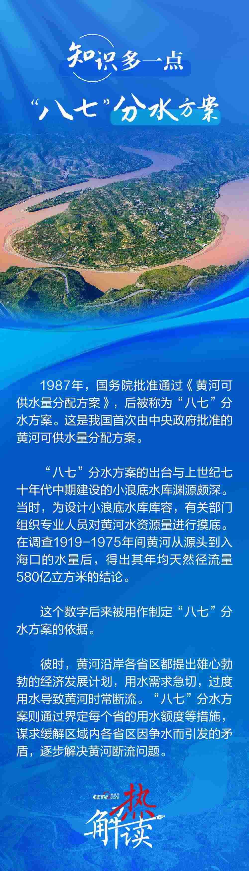 “八七”分水方案是上世紀八十年代我國批準的黃河可供水量分配方案。該方案以1980年實際用水量為基準,綜合考慮了沿黃各省區(qū)的灌溉發(fā)展規(guī)模、工業(yè)和城市用水增長以及大中型水利工程興建等因素,來為沿黃各省區(qū)分配黃河用水權(quán)?!鞍似摺狈炙桨缸?987年國務(wù)院批復(fù)后沿用至今,未重新調(diào)整。