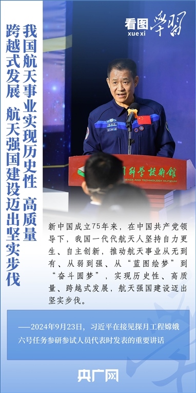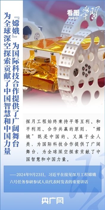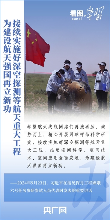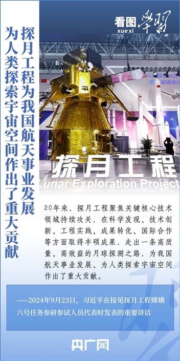 中國探月工程成果凝結(jié)著我國幾代航天人的智慧和心血。9月23日,習(xí)近平總書記接見探月工程嫦娥六號任務(wù)參研參試人員代表并發(fā)表重要講話。總書記高度肯定嫦娥六號任務(wù)成功的重要意義,以及探月工程為我國航天事業(yè)發(fā)展、為人類探索宇宙空間作出的重大貢獻(xiàn),勉勵(lì)航天戰(zhàn)線工作者再接再厲、乘勢而上,為建設(shè)航天強(qiáng)國再立新功。一起來學(xué)習(xí)!