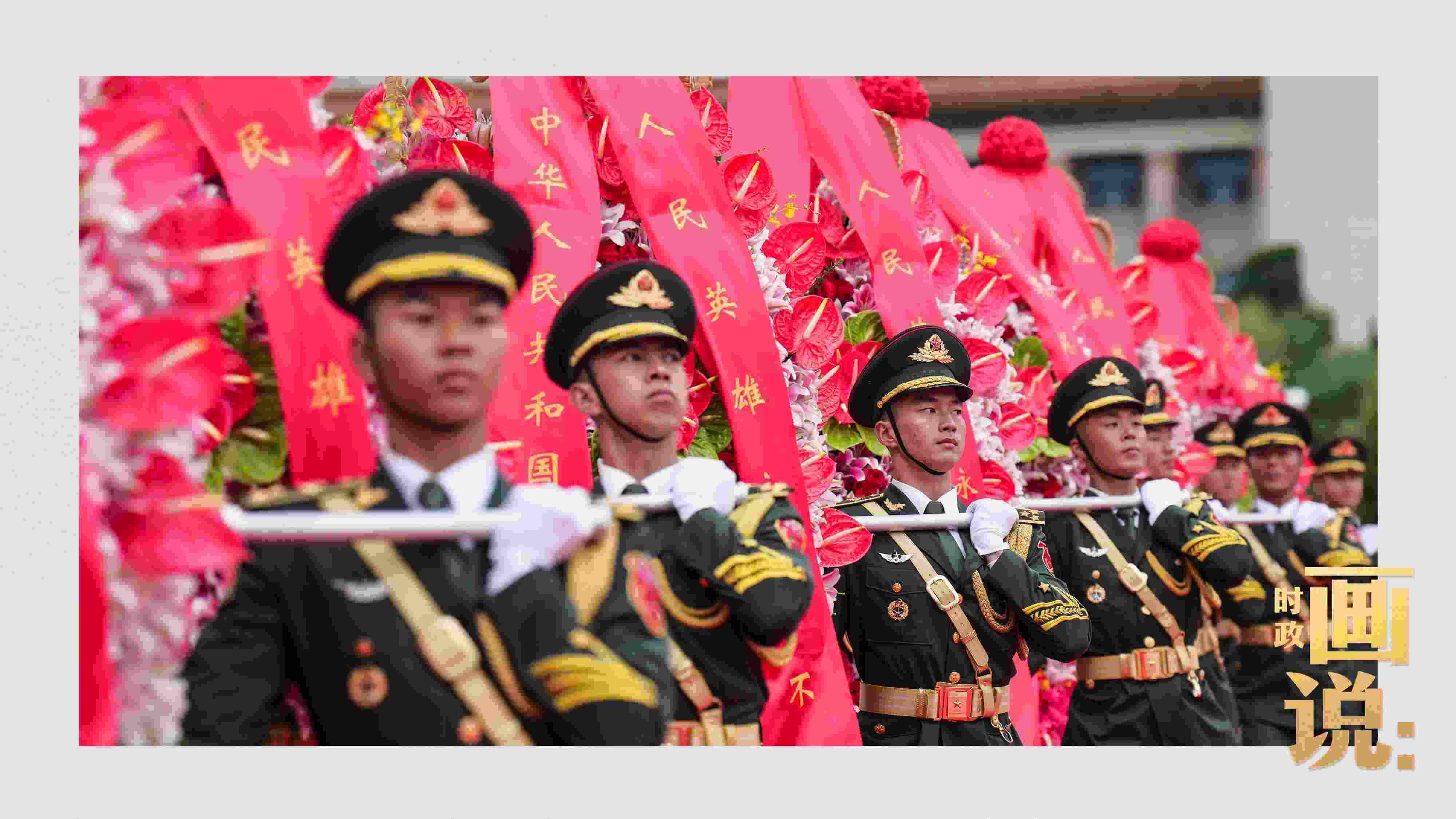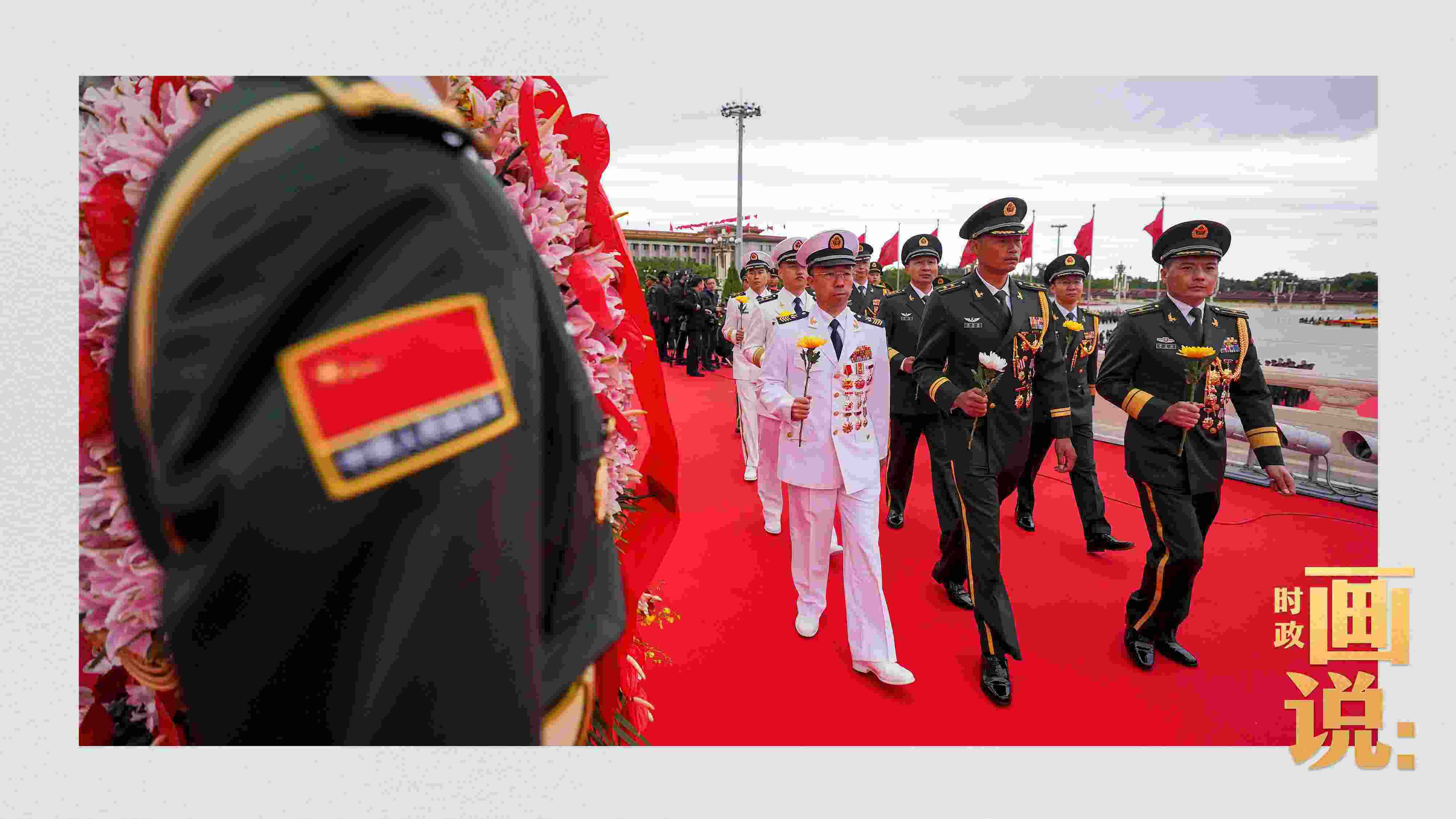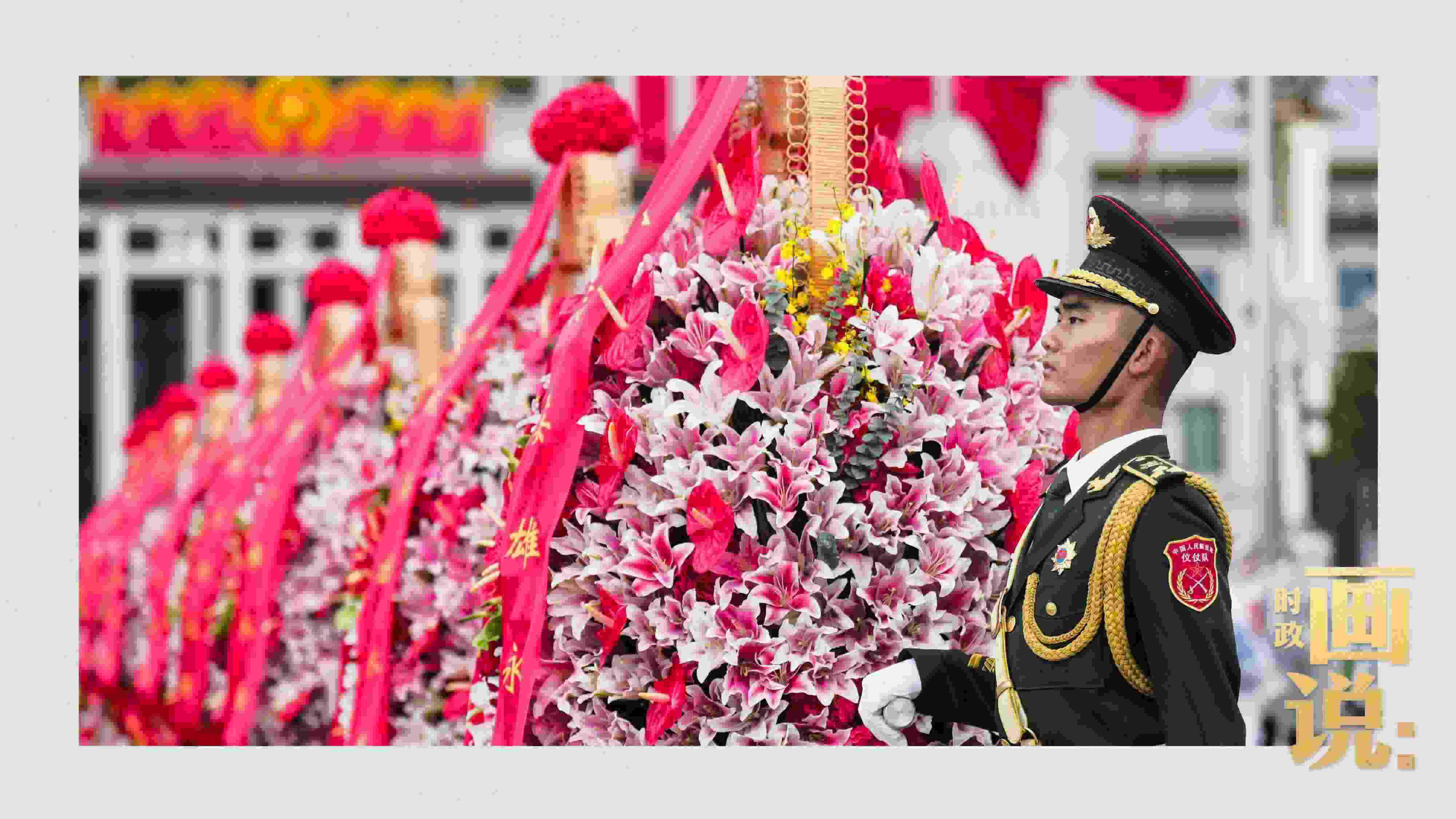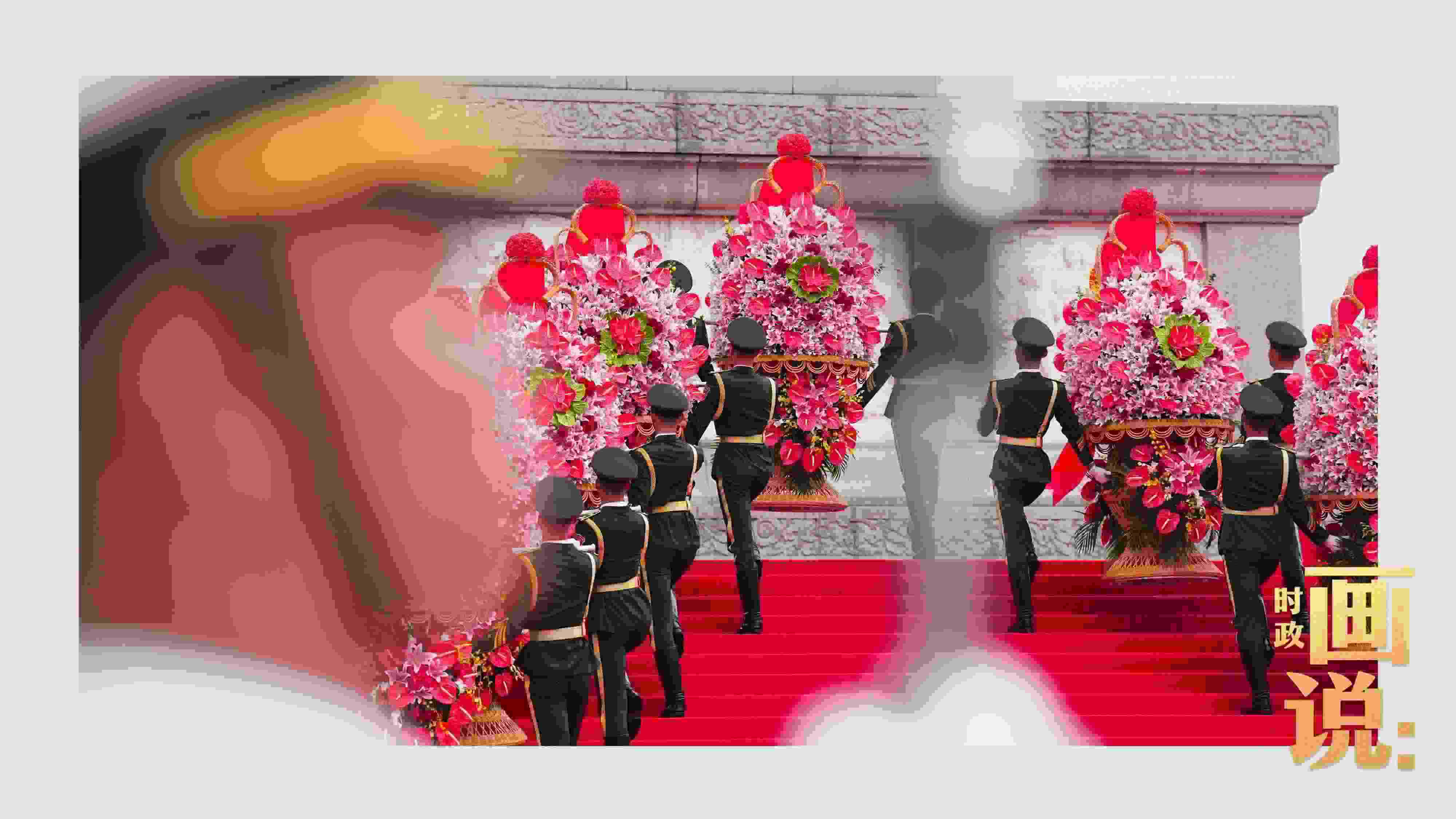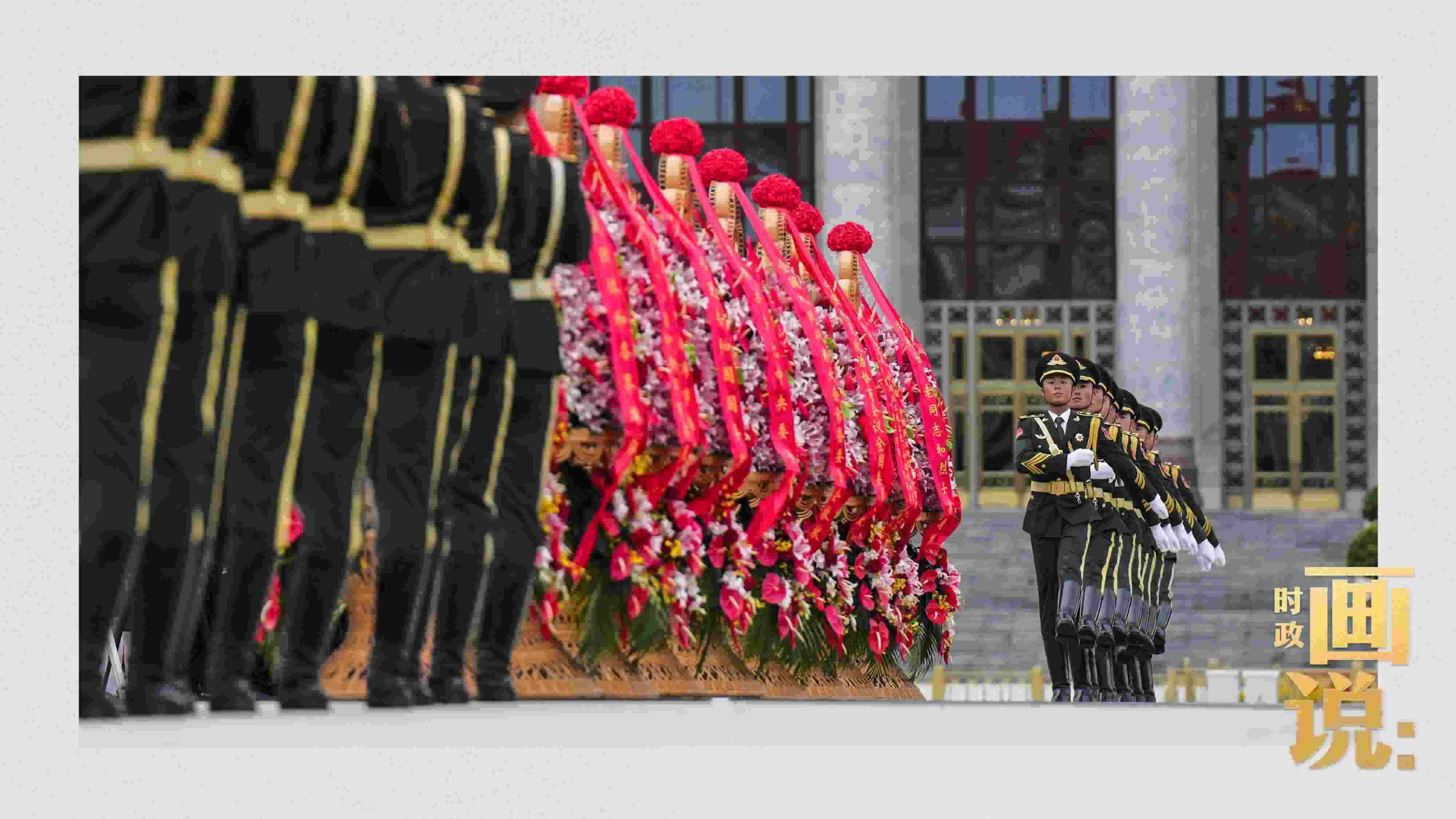 △禮兵抬起花籃,緩步走向人民英雄紀念碑。