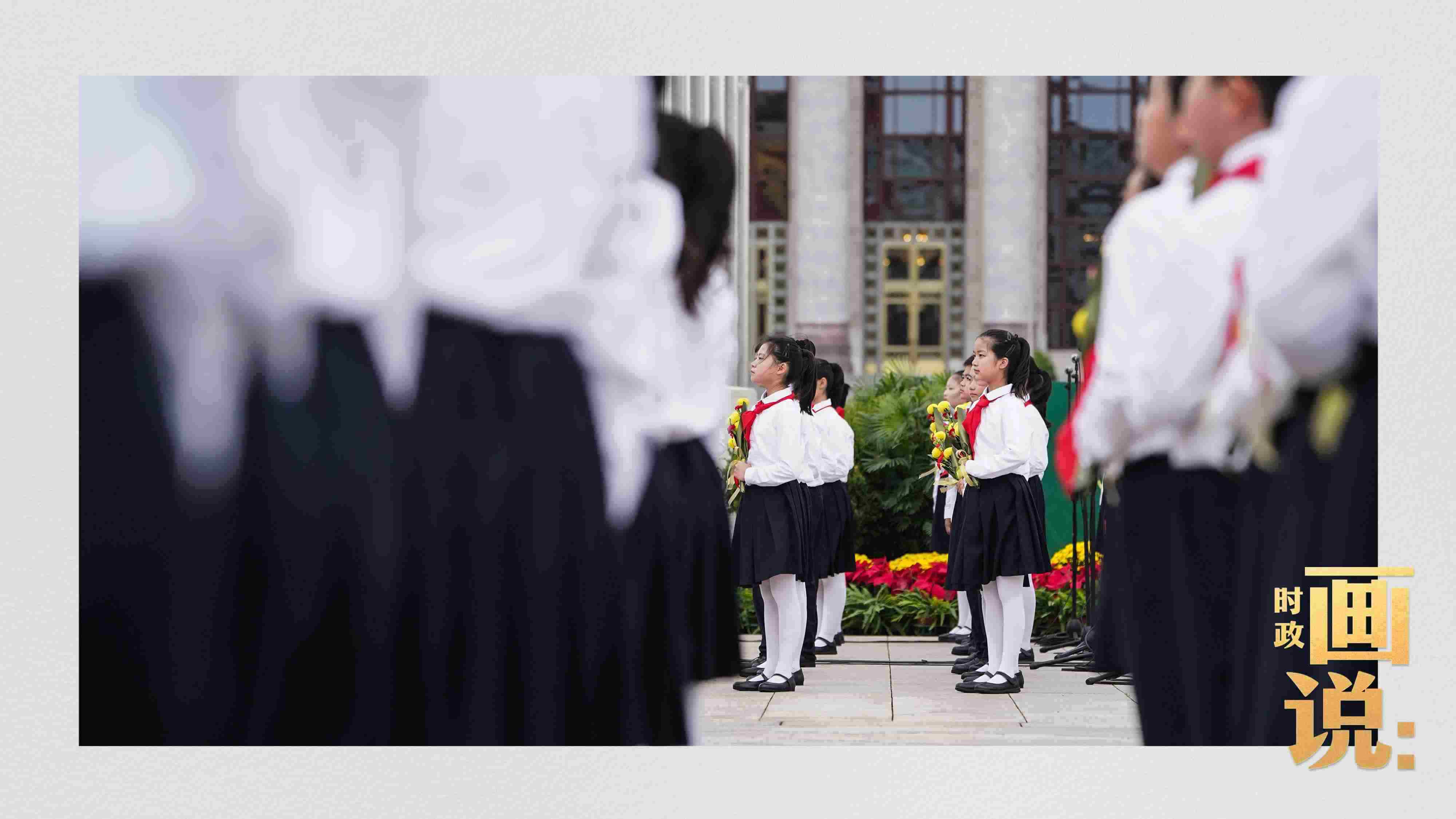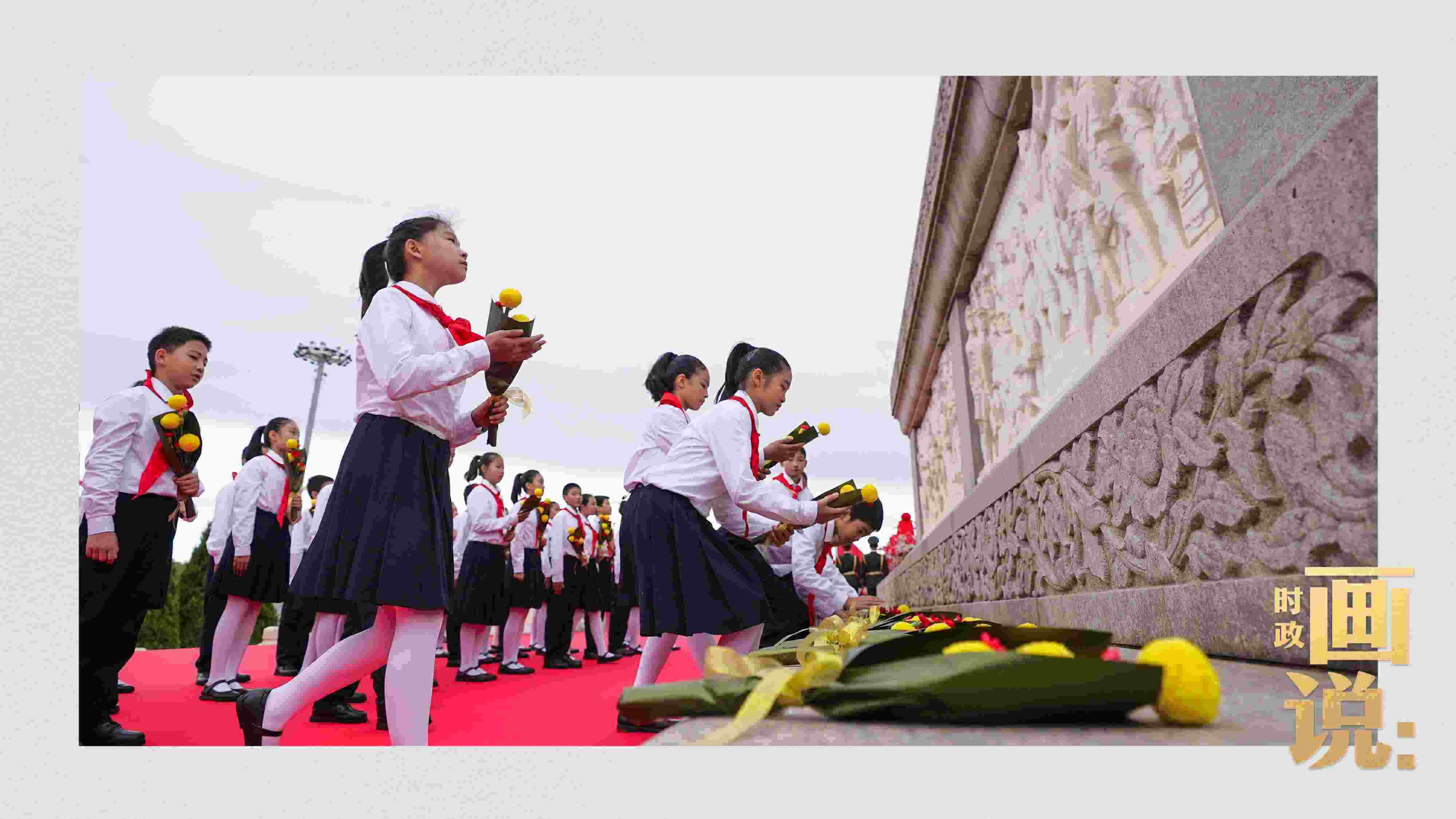 △手持鮮花的少年兒童面向人民英雄紀念碑高唱《我們是共產(chǎn)主義接班人》。