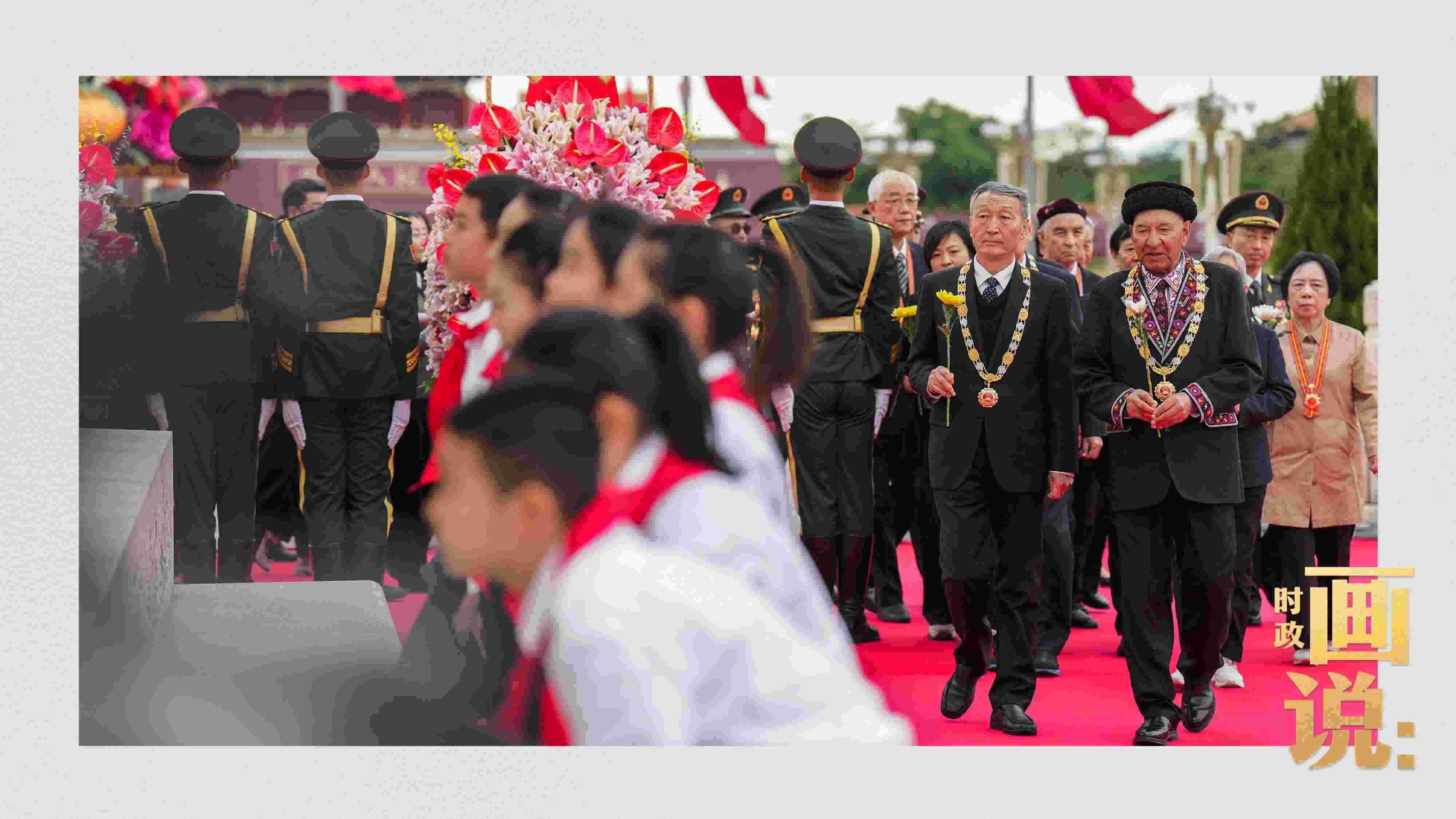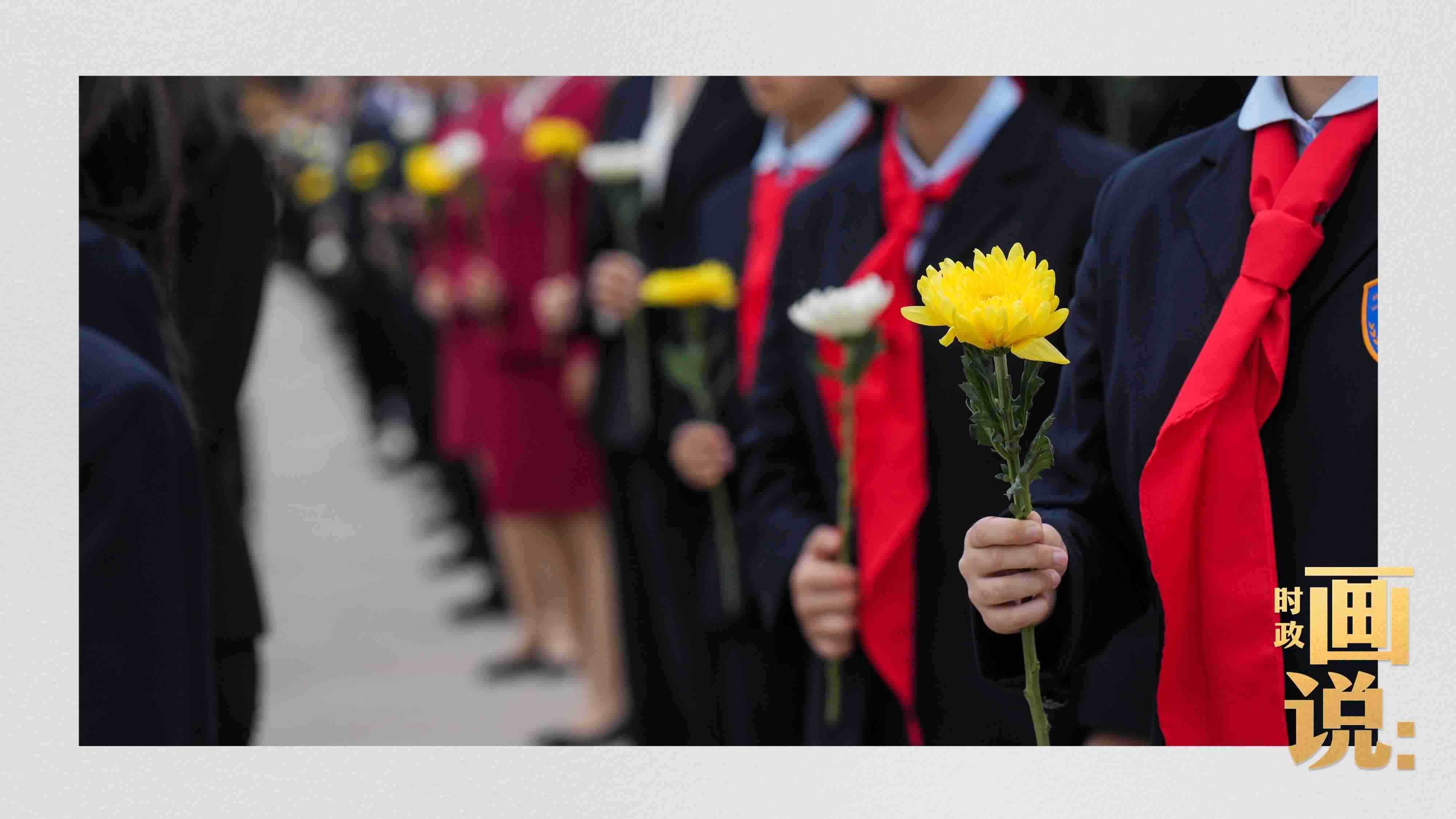△少年兒童和各界代表依次走到紀念碑前,獻上手中鮮花并瞻仰紀念碑。