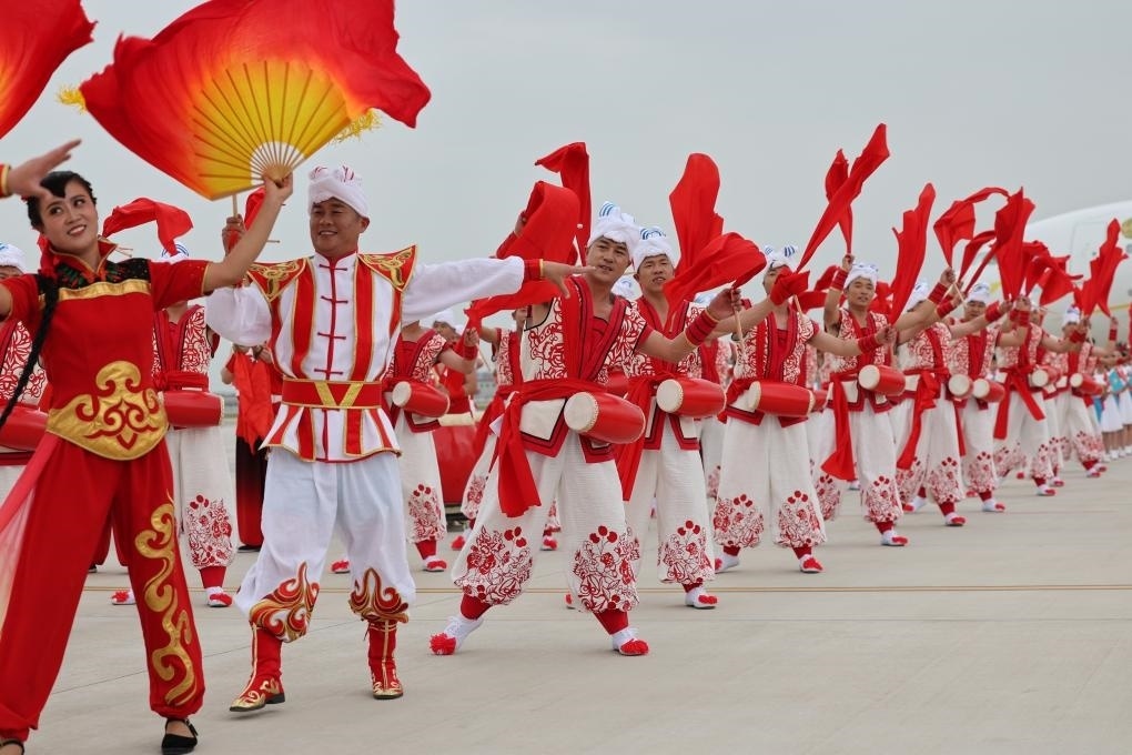 2023年5月17日下午,出席中國-中亞峰會的哈薩克斯坦總統(tǒng)托卡耶夫抵達陜西省西安市。當(dāng)?shù)孛癖娨詿崆榈难摹g快的秧歌等民間藝術(shù)表演歡迎貴賓到來。新華社記者 邢廣利 攝