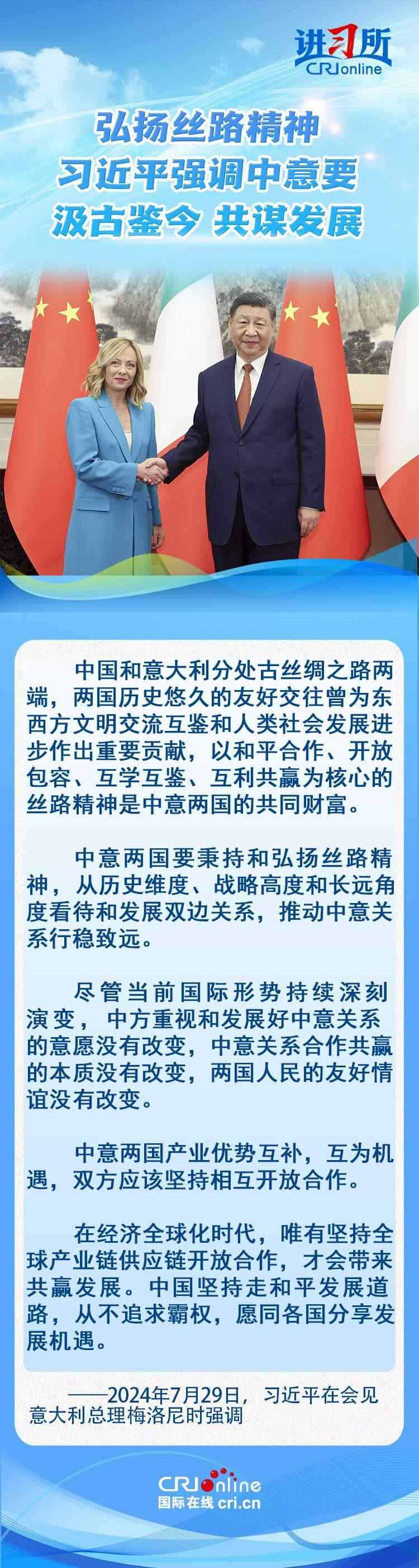 7月29日,中國(guó)國(guó)家主席習(xí)近平在北京會(huì)見(jiàn)來(lái)華進(jìn)行正式訪問(wèn)的意大利總理梅洛尼。習(xí)近平指出,今年是中意建立全面戰(zhàn)略伙伴關(guān)系20周年和馬可·波羅逝世700周年,雙方汲古鑒今、共謀發(fā)展面臨重要機(jī)遇。