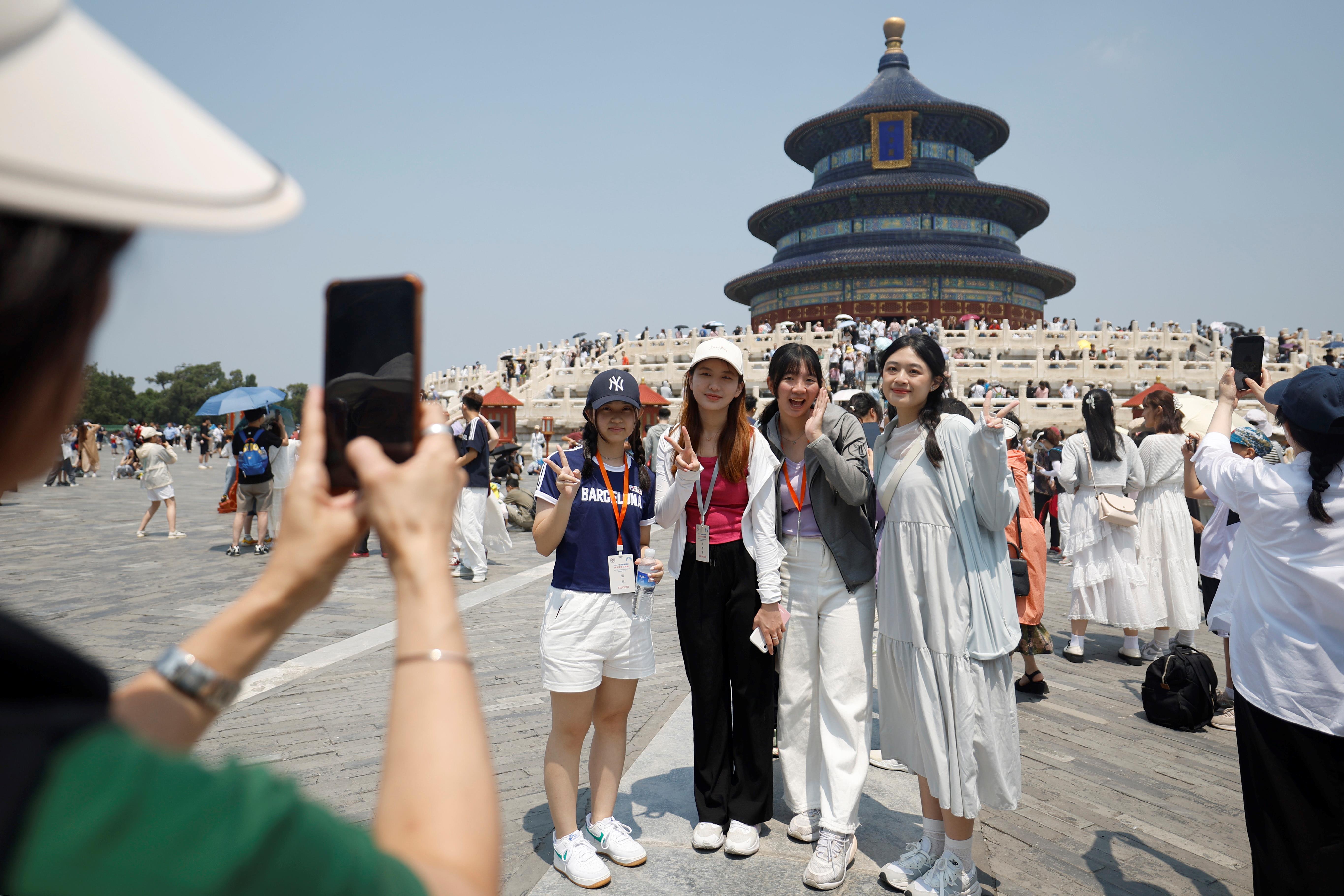 △2024年7月3日,臺(tái)灣青年在天壇公園拍照留念。當(dāng)日,2024“未來能源領(lǐng)袖”兩岸青年交流營的營員參觀游覽北京的奧林匹克公園、天壇公園等地。