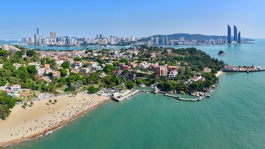 游人在廈門鼓浪嶼沙灘上游玩(無(wú)人機(jī)照片)。新華社記者 姜克紅 攝