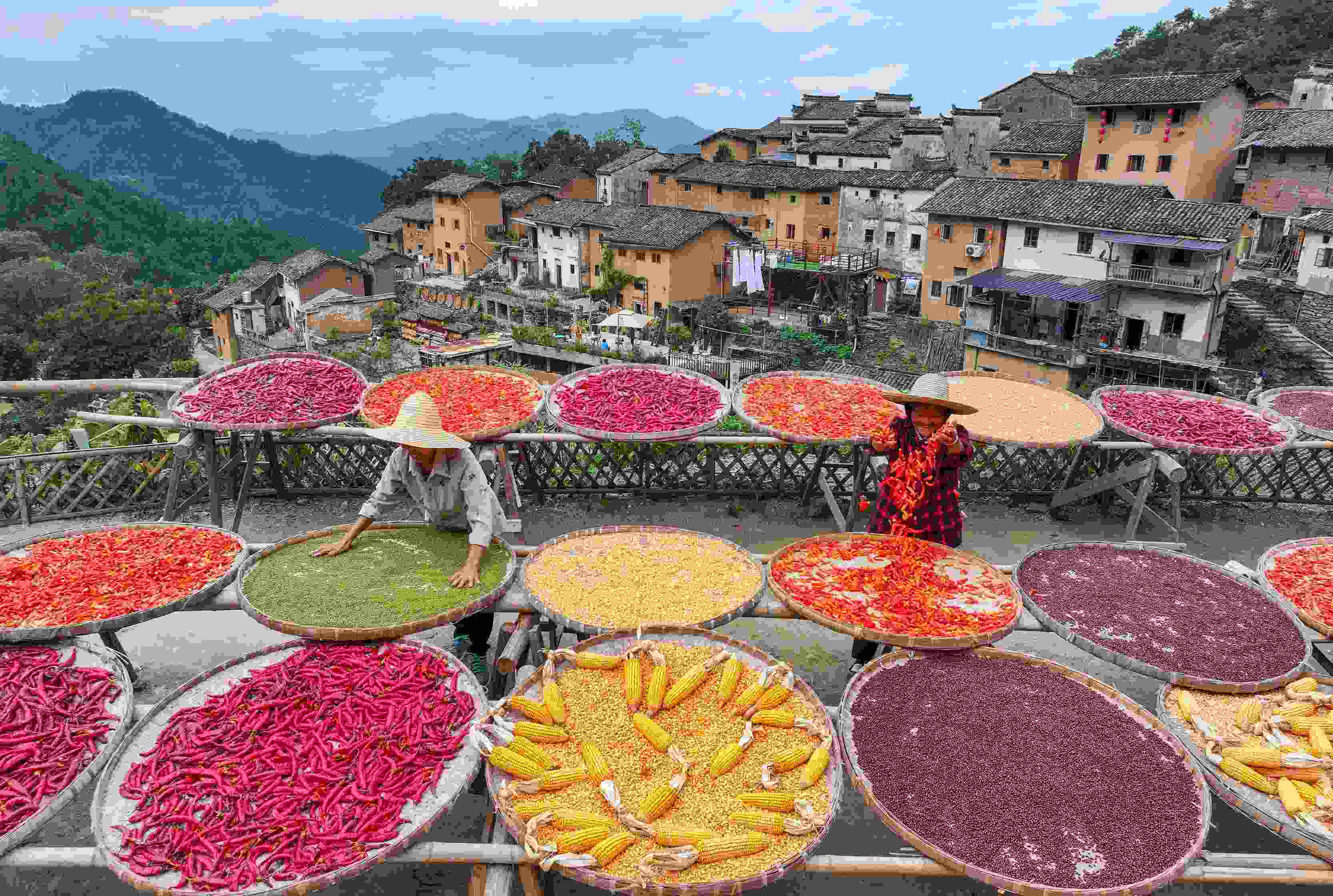 △2024年9月22日,安徽省黃山市歙縣陽產(chǎn)村,村民正在土樓前晾曬農作物。