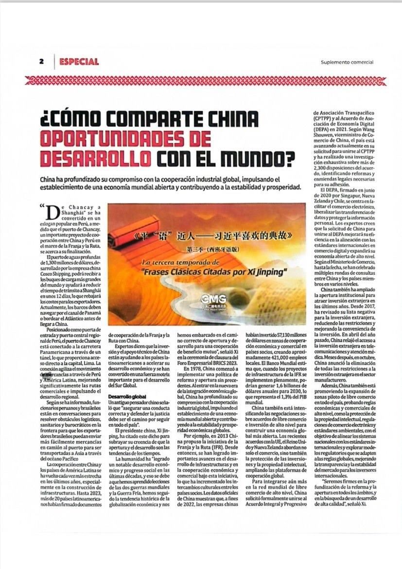 11月14日,秘魯最具影響力的官方報紙《秘魯人報》刊發(fā)節(jié)目在秘魯落播的消息。文章指出,《平“語”近人——習(xí)近平喜歡的典故》第三季展現(xiàn)了中華民族開放包容、兼收并蓄的文化胸懷,闡釋了習(xí)近平主席提出的推動構(gòu)建人類命運(yùn)共同體的這一重大理念,是對“建設(shè)一個什么樣的世界、怎樣建設(shè)這個世界”給出的中國方案?!睹佤斎藞蟆诽乜婵l(fā)《平“語”近人——習(xí)近平喜歡的典故》第三季(西班牙語版)將在秘魯主流媒體落播特稿。《秘魯人報》官網(wǎng)也同步刊發(fā)了節(jié)目預(yù)告消息和海報。