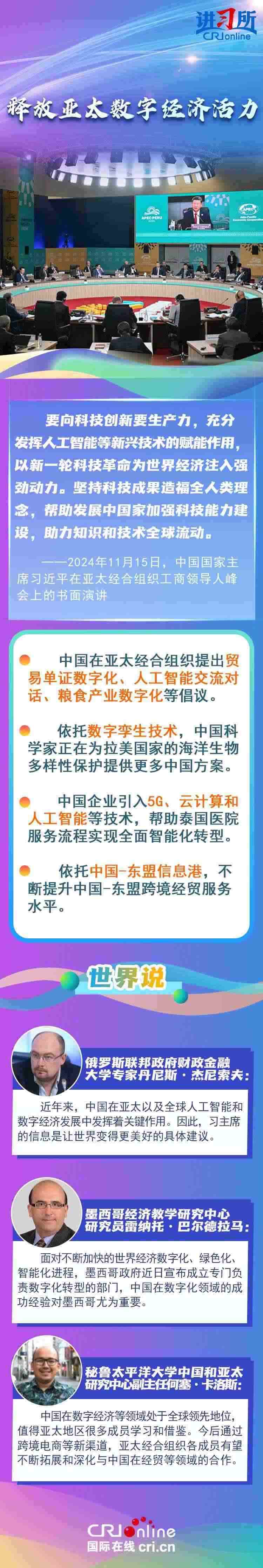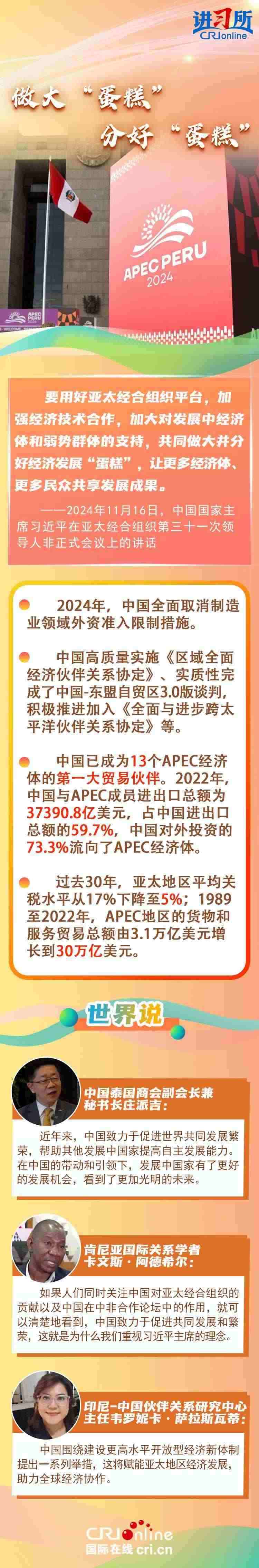 自1991年加入APEC以來,中國作為關(guān)鍵一員,持續(xù)為亞太地區(qū)成為世界經(jīng)濟的“火車頭”輸出關(guān)鍵穩(wěn)定力量,習(xí)近平主席表示,“落其實者思其樹,飲其流者懷其源”。中國的發(fā)展離不開亞太,也將進一步造福亞太。多國人士表示,在中國的帶動和引領(lǐng)下,發(fā)展中國家有了更好的發(fā)展機會,看到了更加光明的未來。