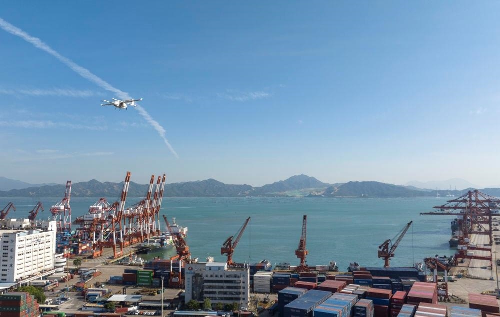 △無人機(jī)搭載快件從珠海飛抵深圳蛇口集裝箱碼頭起降點(diǎn)。