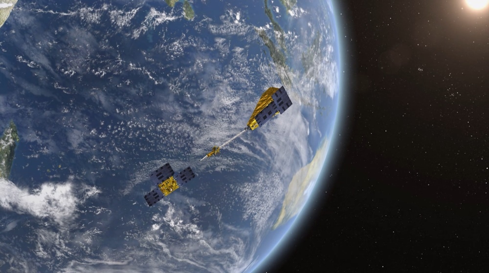 “澳科一號(hào)”衛(wèi)星在軌示意圖(右為A星,左為B星)。圖片由澳門(mén)科技大學(xué)“澳科一號(hào)”團(tuán)隊(duì)提供