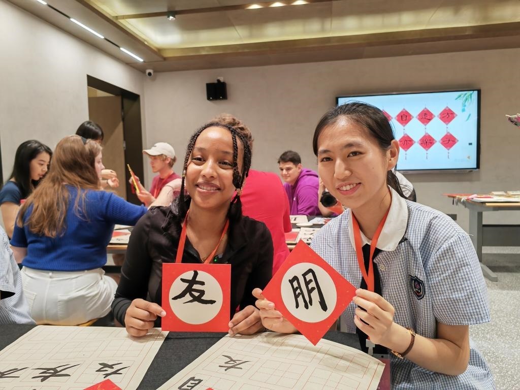 2024年6月8日,在河北省石家莊外國(guó)語(yǔ)學(xué)校,美國(guó)山谷高中學(xué)生娜斯拉(左一)在上漢字書(shū)法課。新華社記者 杜一方 攝