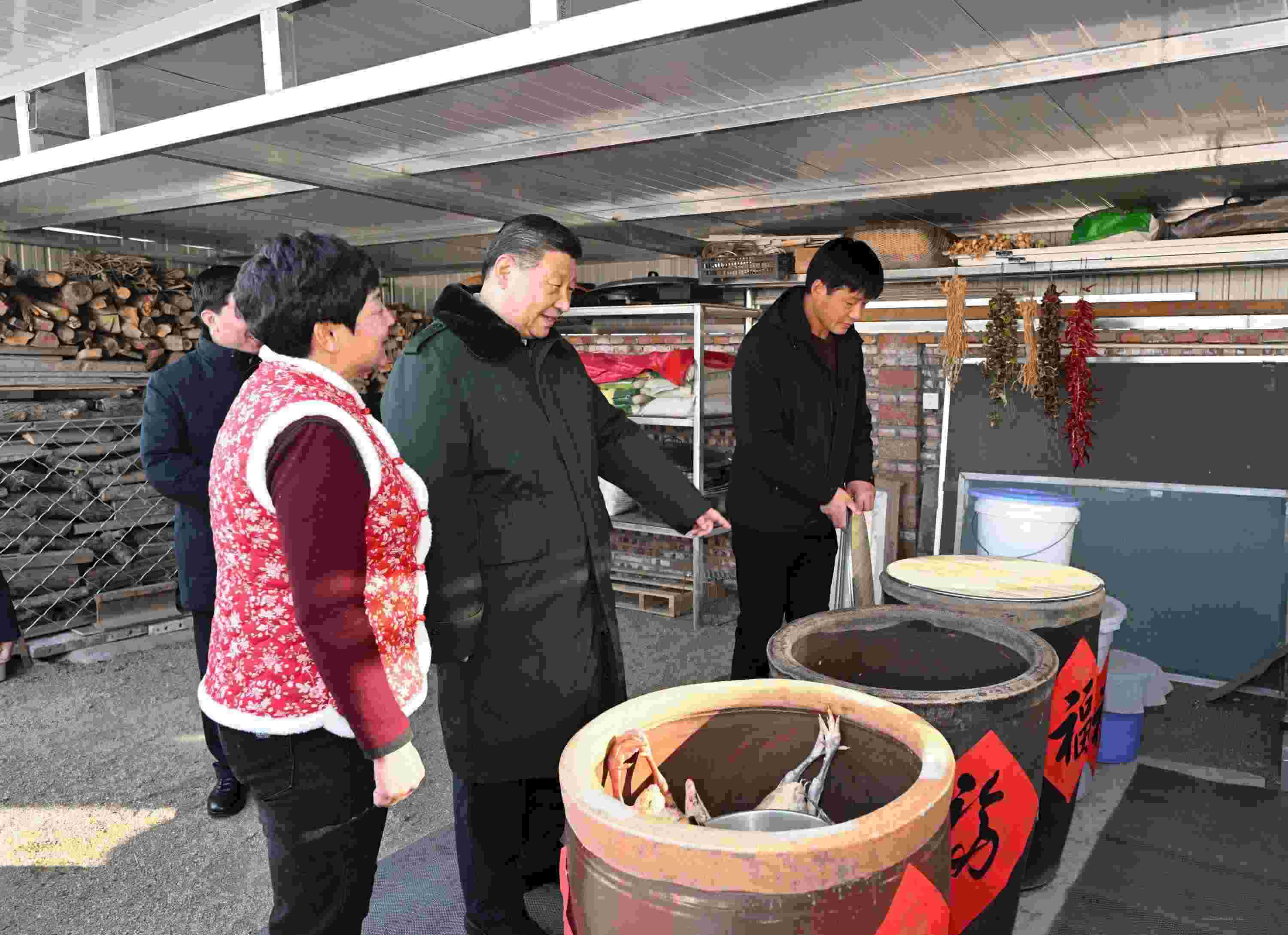 在村民師紅兵家,總書記掀開墻邊大缸的蓋子,一一觀瞧;轉(zhuǎn)到儲藏室、廚房等察看年貨,然后洗手加入霍州年饃的制作。