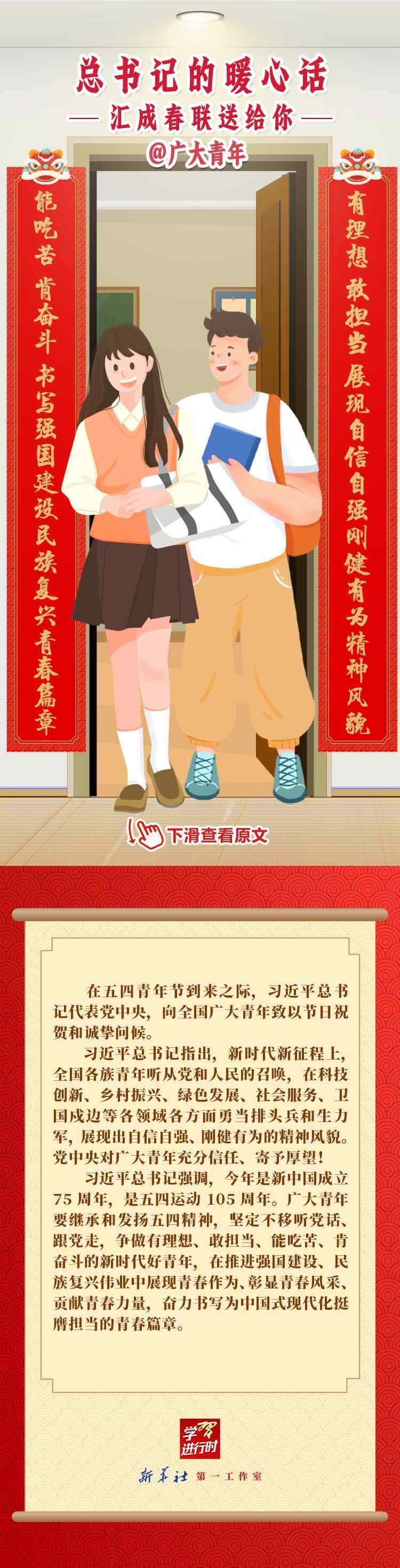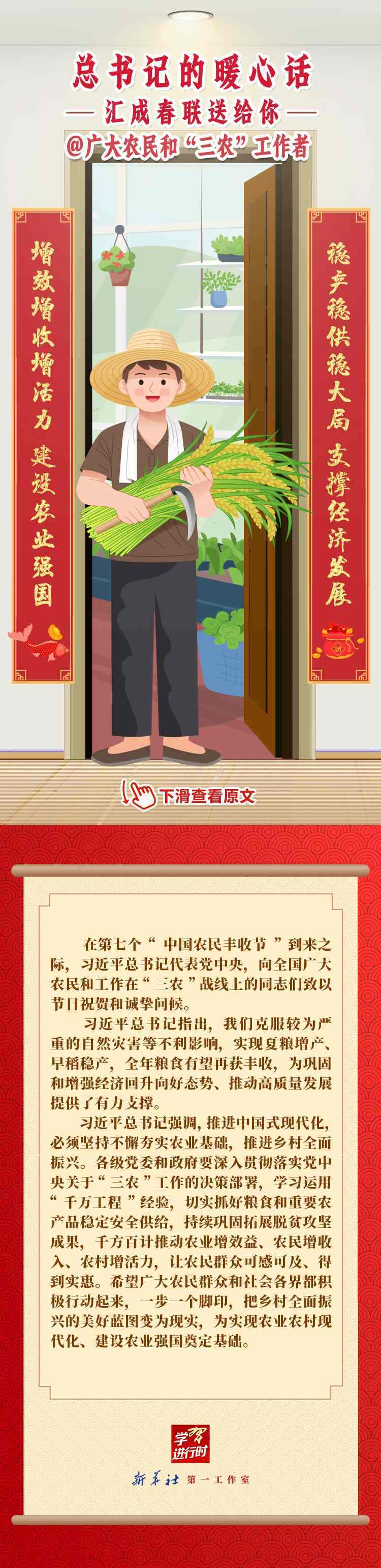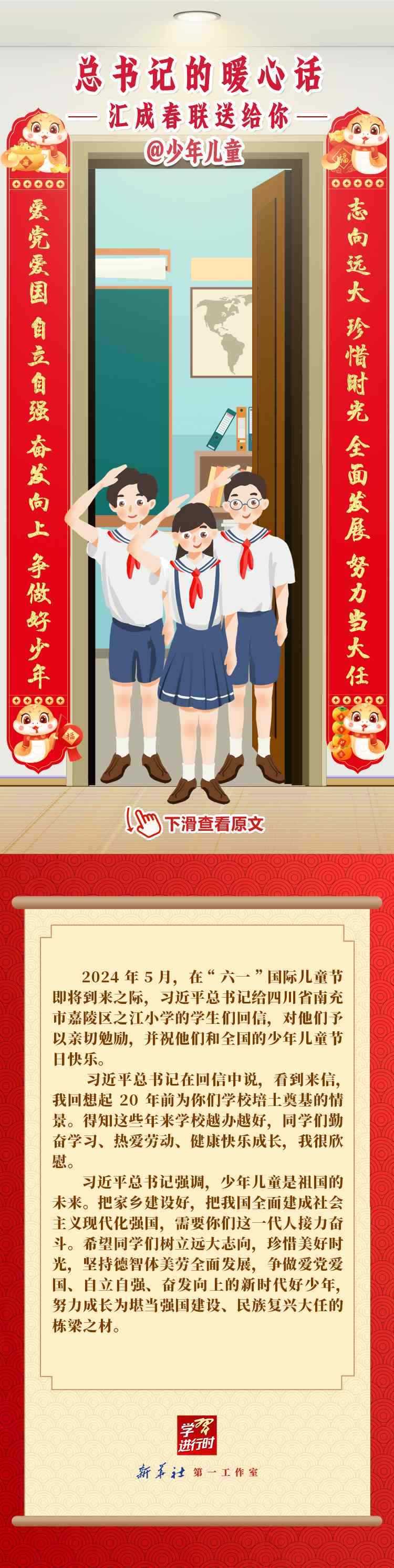 【學(xué)習(xí)進(jìn)行時(shí)】過春節(jié),貼春聯(lián),寄托人們對(duì)新年的美好愿望。過去一年,習(xí)近平總書記在不同場合點(diǎn)贊各行各業(yè)奮斗者,說了許多暖心話。新春之際,我們匯編成聯(lián),向新征程上的每一位“主角”致敬,送上新春的祝福。
