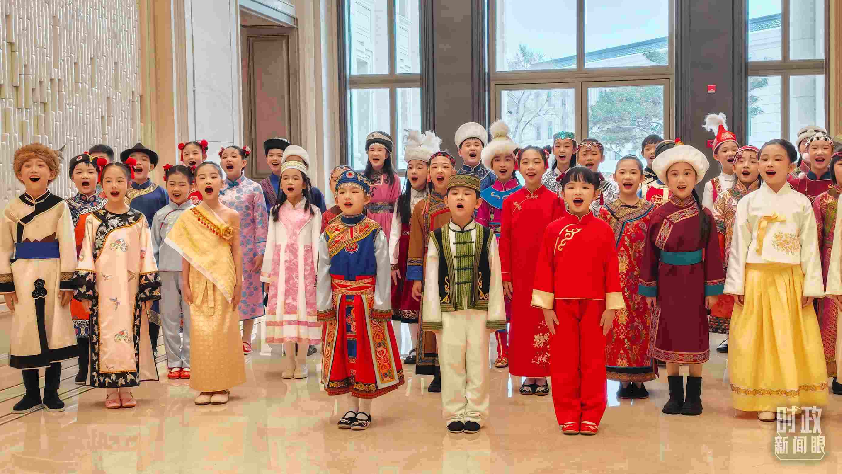 △歡迎宴會(huì)現(xiàn)場,少年兒童正在合唱黑龍江民歌《烏蘇里船歌》。(總臺(tái)央視記者閆耀東拍攝)