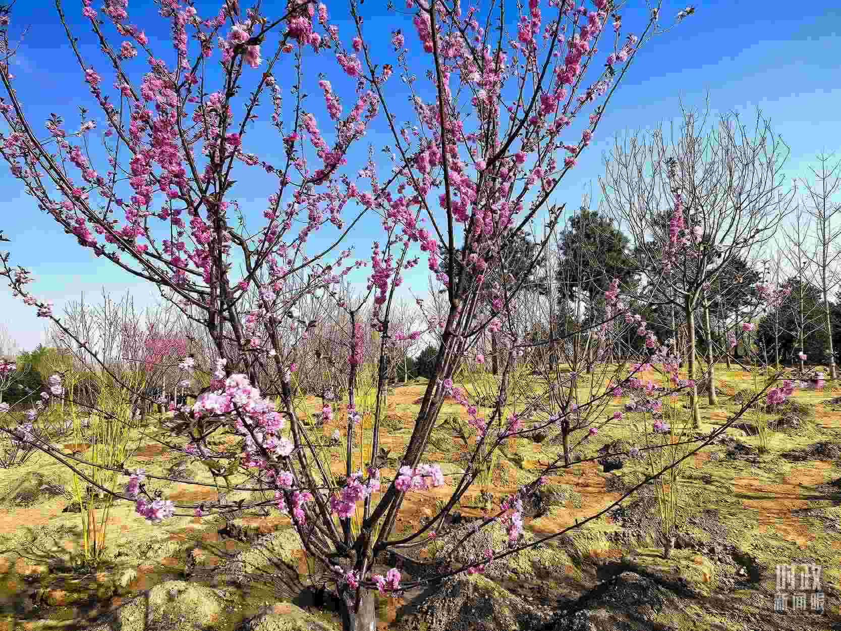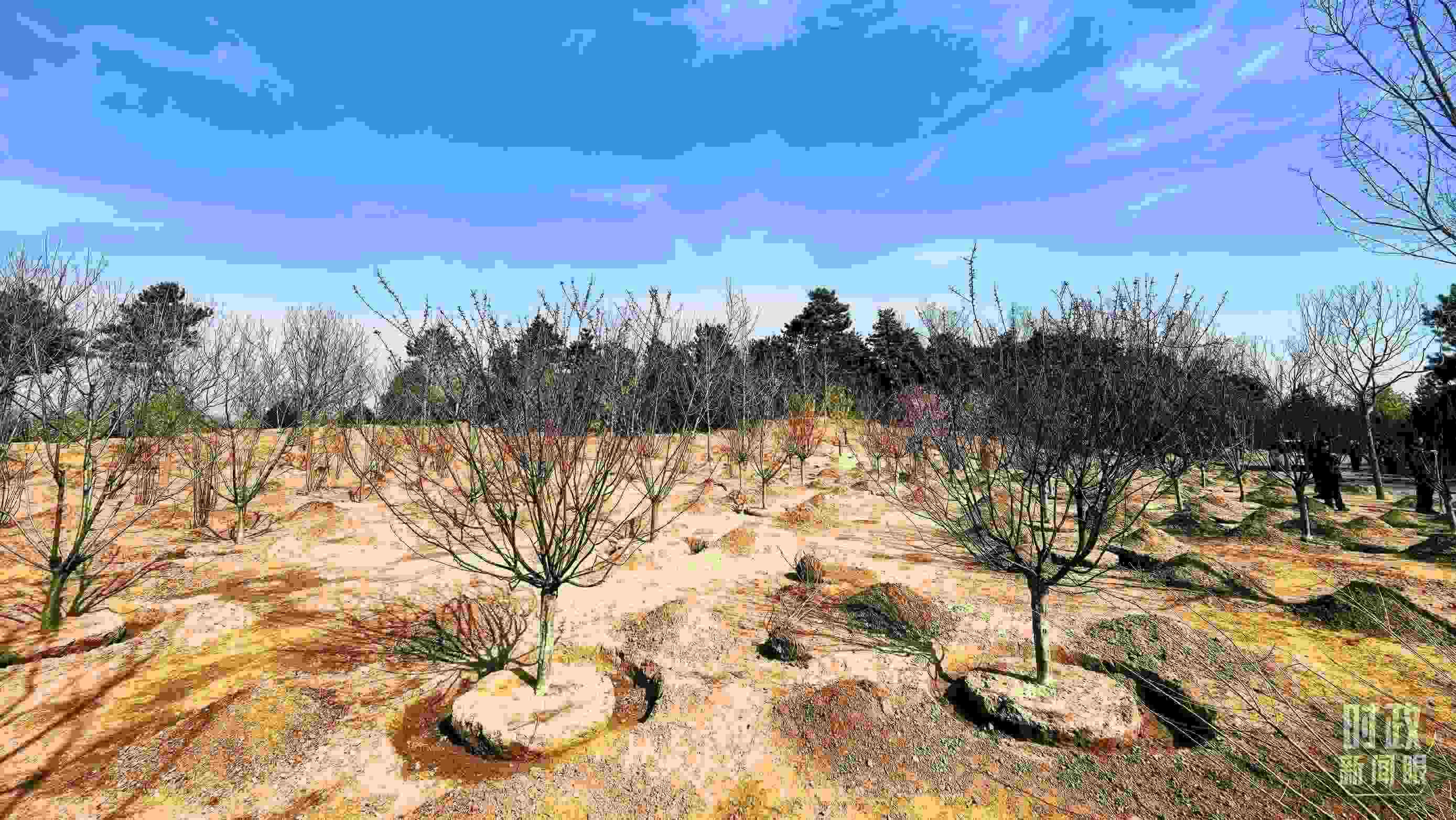 △永定河畔植樹點(diǎn),春意上枝頭。(總臺(tái)央視記者胡瑋、程鋮拍攝)