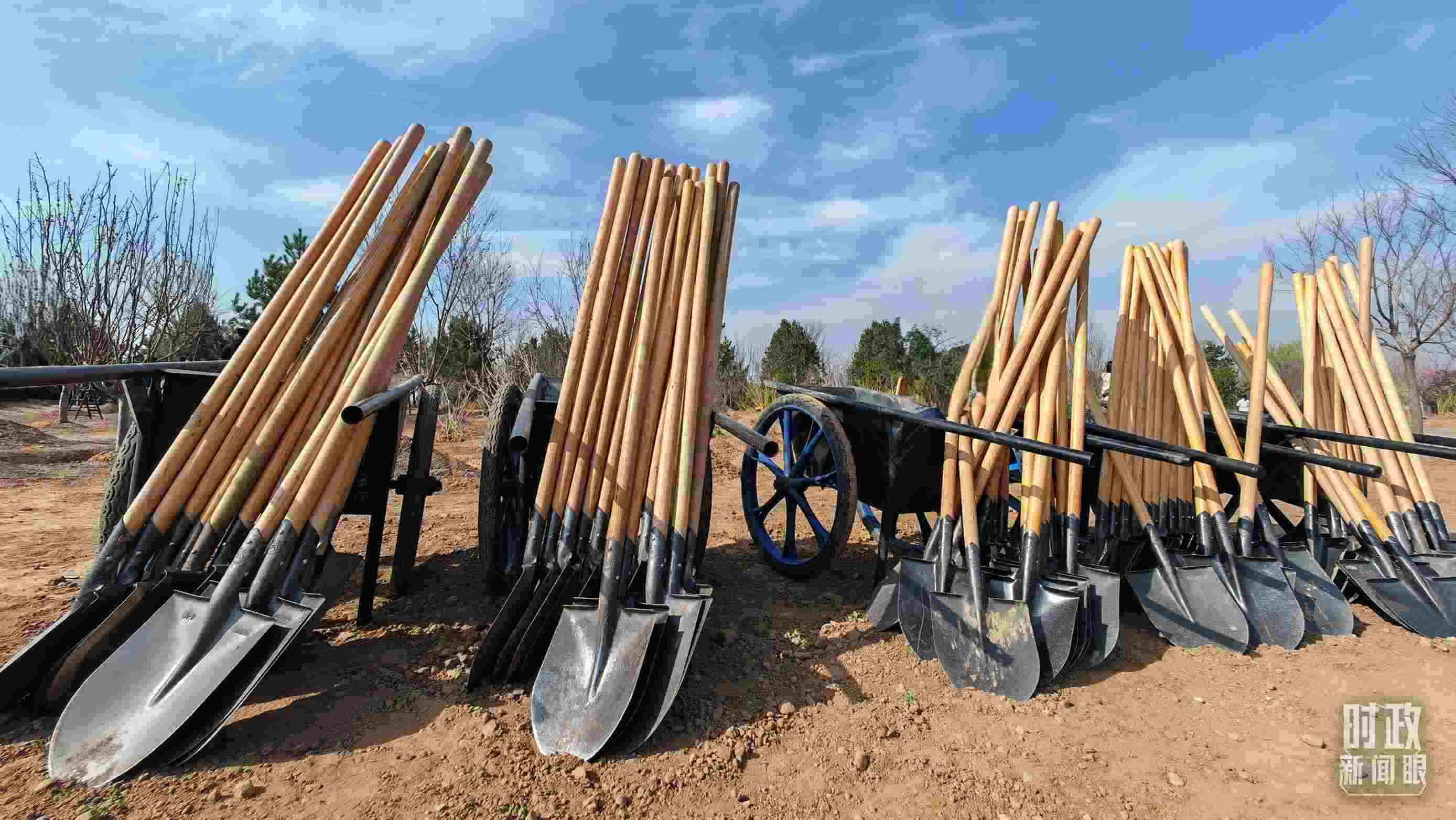 △植樹現(xiàn)場(chǎng)整齊擺放的工具。(總臺(tái)央視記者王策拍攝)