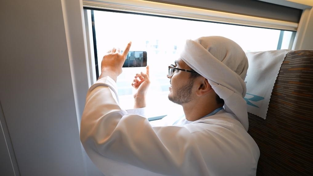 4月7日,從北京開往天津站的高鐵上,一名阿聯(lián)酋學(xué)生用手機(jī)拍攝窗外風(fēng)景。新華社記者 胡震澤 攝