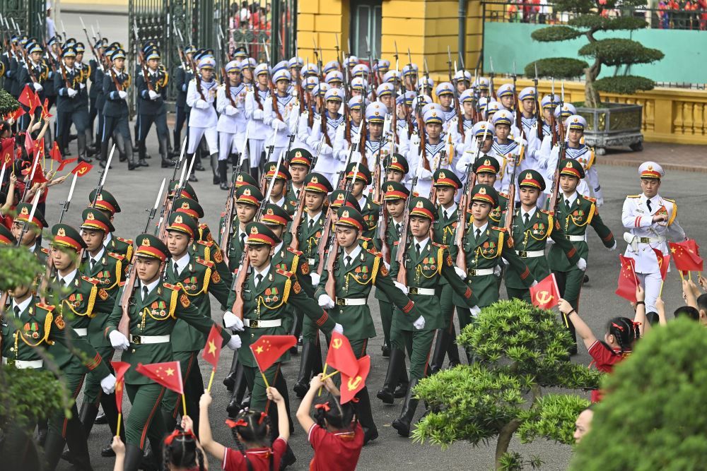 當(dāng)?shù)貢r(shí)間4月14日,中共中央總書(shū)記、國(guó)家主席習(xí)近平在河內(nèi)出席越共中央總書(shū)記蘇林舉行的歡迎儀式。