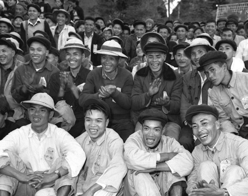 1959年12月,來自越南的客人在兩國邊境居民慶祝共建水利工程完工聯(lián)歡會上觀看演出。