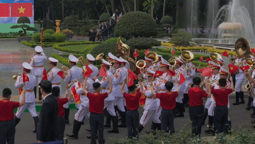 軍樂(lè)團(tuán)奏中越兩國(guó)國(guó)歌,鳴禮炮21響。