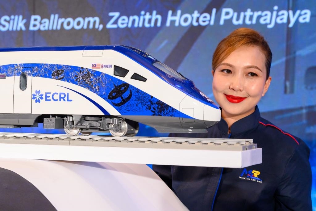 2024年12月18日,在馬來西亞普特拉賈亞,模特與新的動車組模型合影。新華社發(fā)(張紋綜攝)