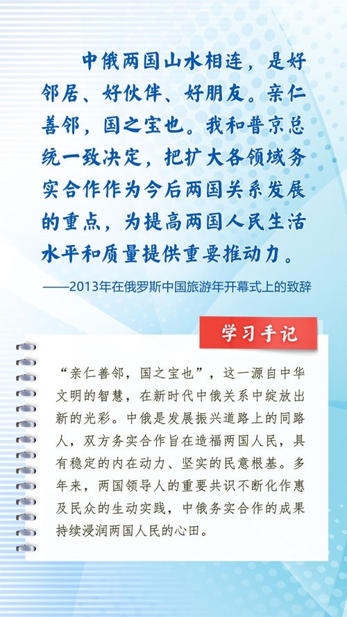 中華民族和俄羅斯民族都有悠久的歷史、古老的文明、燦爛的文化,都是偉大的民族。近年來,習近平主席常常引用中國詩詞古語、俄羅斯諺語名言等,寄語中俄關系發(fā)展和全人類和平與發(fā)展。這些重要論述,蘊含對文明、歷史的深邃思考,指引著新時代的中俄關系不斷向前,為世界百年變局中的人類文明進步事業(yè)指明方向。