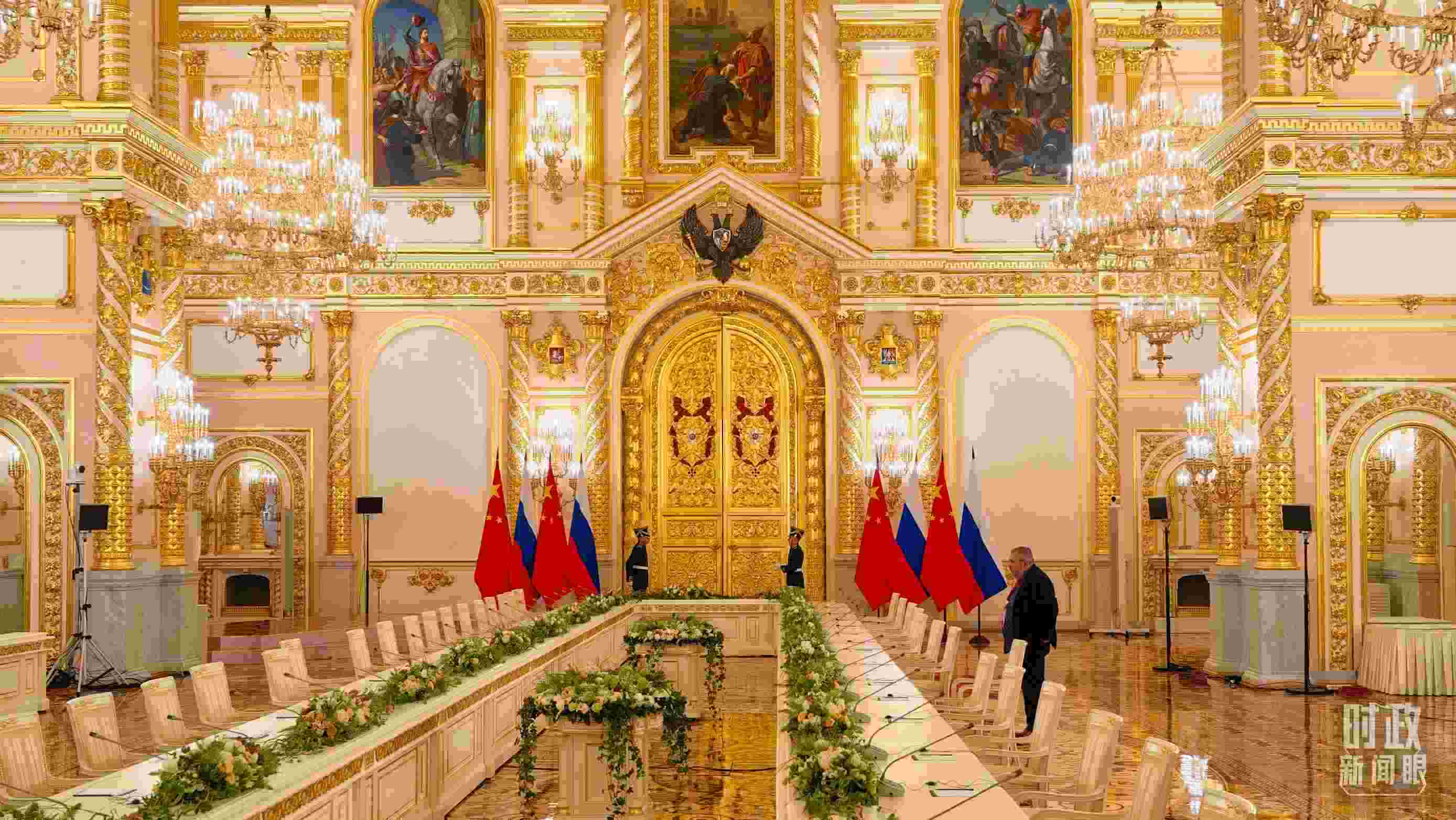 8日上午,在克里姆林宮二層的喬治大廳,普京總統(tǒng)為習(xí)主席舉行隆重歡迎儀式。兩國元首從兩側(cè)沿紅地毯健步走入大廳中央,親切握手合影。2019年、2023年習(xí)主席對俄羅斯進(jìn)行國事訪問時(shí),普京總統(tǒng)也是在這里為習(xí)主席舉行隆重歡迎儀式。