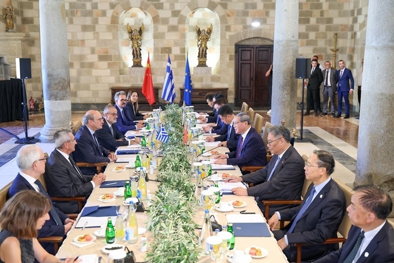 當(dāng)?shù)貢r(shí)間7月4日下午,國(guó)務(wù)院總理李強(qiáng)在希臘羅德島會(huì)見(jiàn)希臘副總理哈齊達(dá)基斯。新華社記者 劉彬 攝