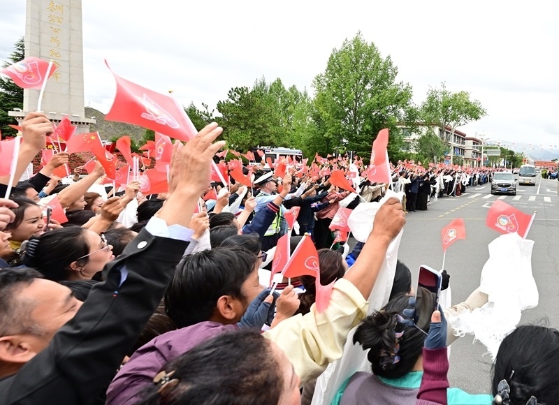 8月20日中午,中共中央總書記、國(guó)家主席、中央軍委主席習(xí)近平率中央代表團(tuán)乘專機(jī)抵達(dá)拉薩,出席西藏自治區(qū)成立60周年慶?;顒?dòng)。習(xí)近平等從機(jī)場(chǎng)乘車到住地途中,各族群眾在街道兩旁熱情歡迎。