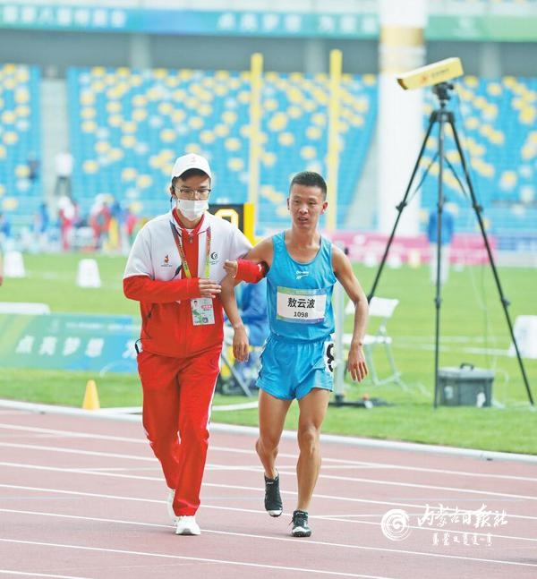 志愿者攙扶內蒙古殘疾人運動員敖云波。