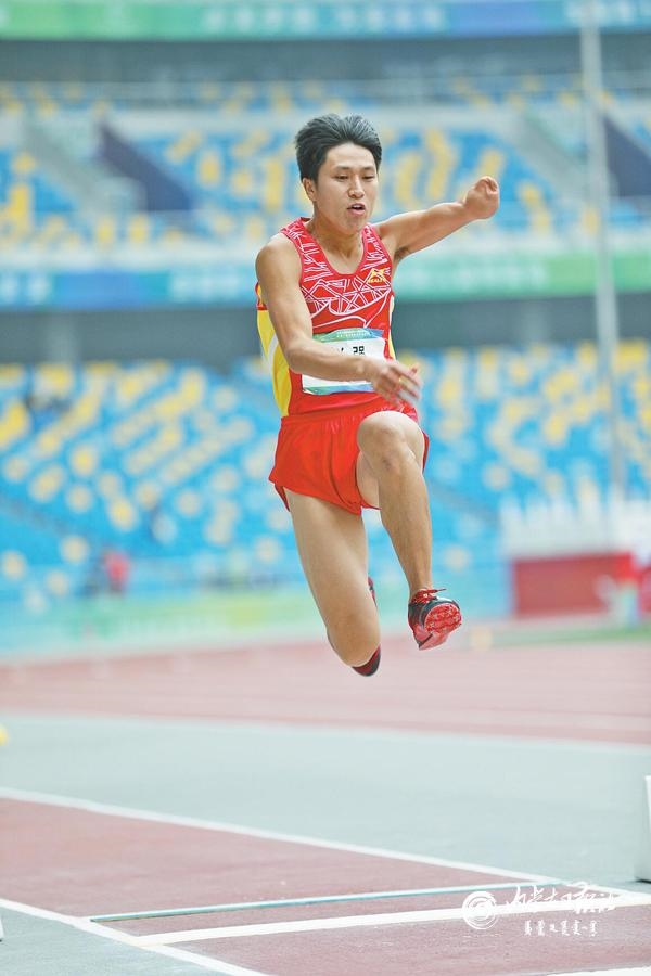 10月25日,內蒙古運動員趙強在跳遠比賽上奮力一跳。