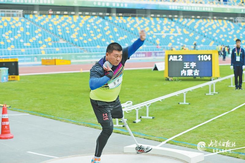 內蒙古肢體殘疾運動員王宇在鉛球比賽上的投球瞬間。