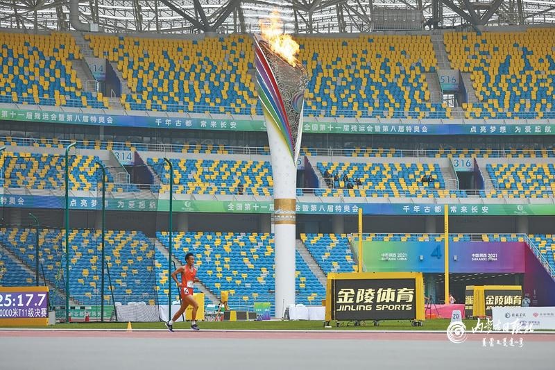 10 月23 日,男子t11 級10000米的賽場上,內蒙古運動員孟可在沒有領跑員的不利條件下,依然堅持跑完了全程。