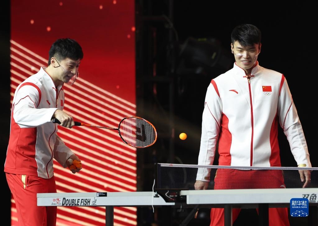 12月20日,內(nèi)地奧運(yùn)健兒代表團(tuán)成員馬龍(左)與王懿律在活動(dòng)中參與游戲。