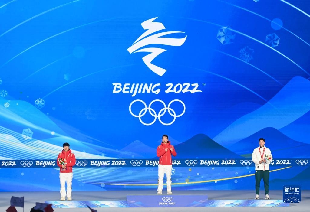 當(dāng)日,北京2022年冬奧會短道速滑男子1000米獎牌頒發(fā)儀式在北京賽區(qū)頒獎廣場舉行。