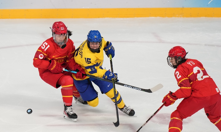 2月7日,中國隊球員張喜芳(左)與瑞典隊球員莉薩·約翰松(中)在比賽中拼搶。新華社記者孟永民攝