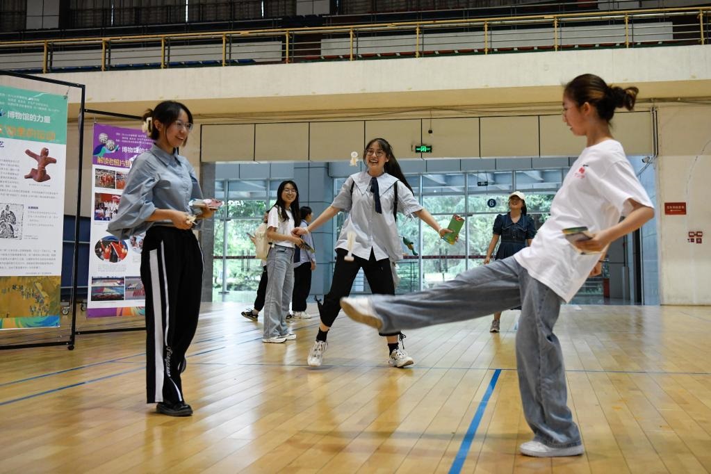 5月23日,在四川大學江安校區(qū)體育館,學生在體驗傳統(tǒng)體育項目踢毽子。新華社記者胥冰潔攝