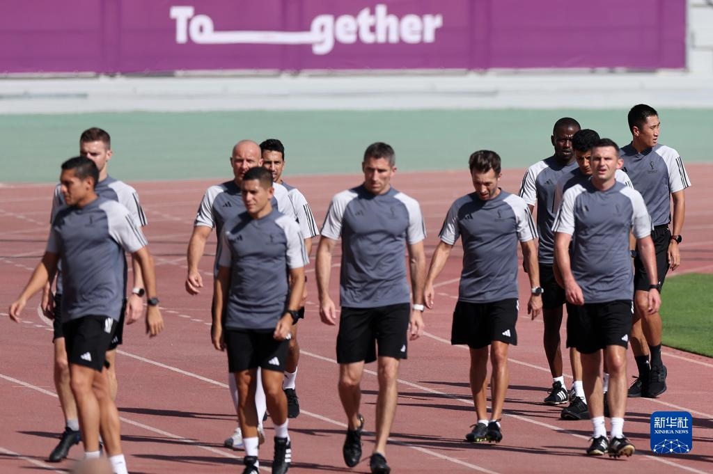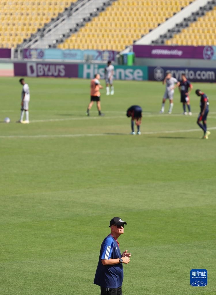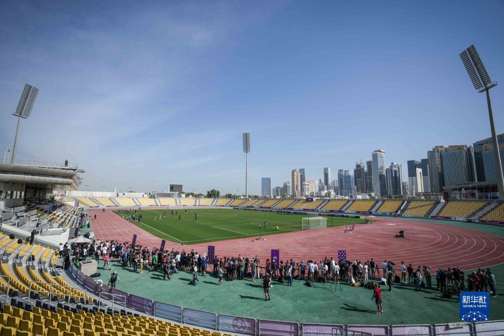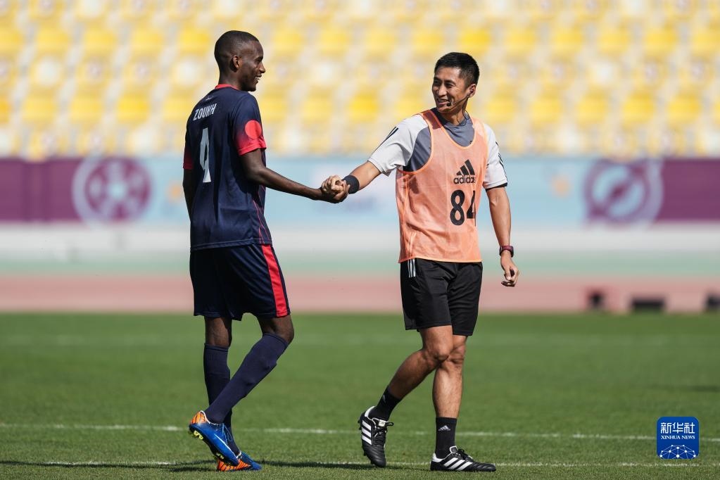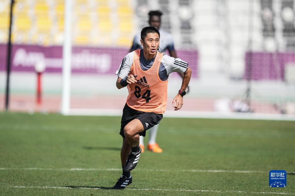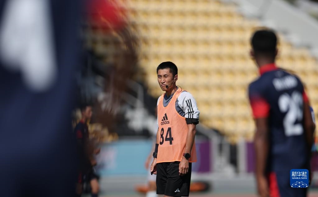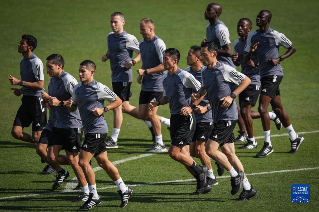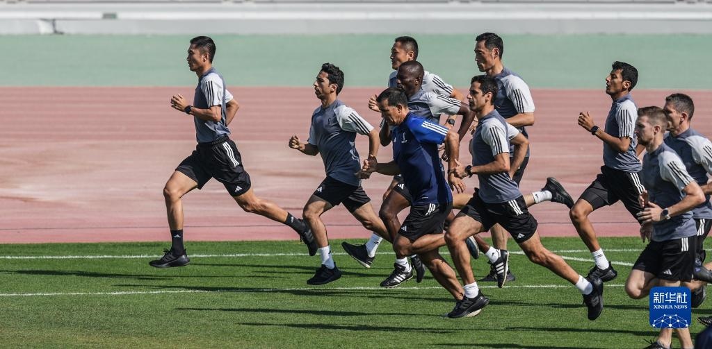 當日,入選2022年卡塔爾世界杯裁判員名單的中國裁判馬寧、曹奕與施翔在卡塔爾體育俱樂部球場進行訓(xùn)練。