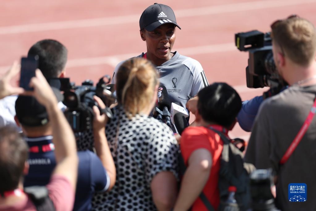 11月18日,盧旺達女主裁穆坎桑加(后)在訓(xùn)練前接受采訪。本屆世界杯將首次出現(xiàn)由女主裁執(zhí)法比賽。新華社記者 賈浩成 攝