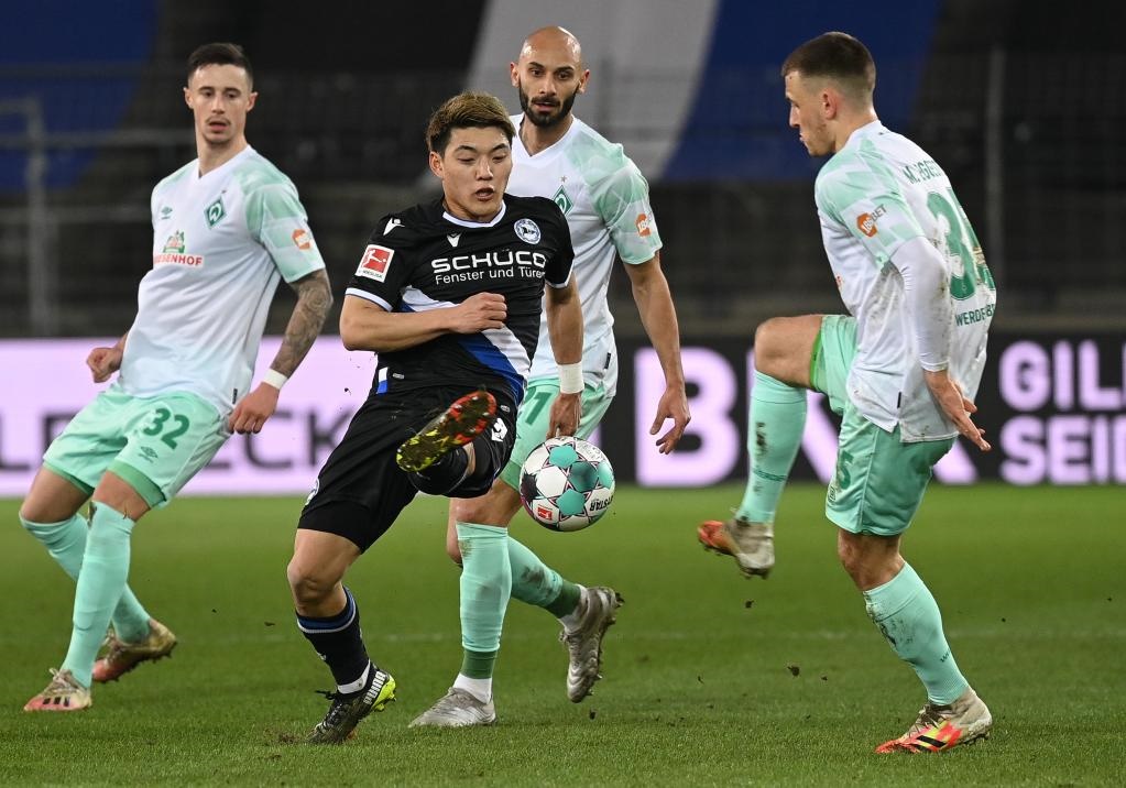 2021年3月10日,當(dāng)時效力于比勒菲爾德隊的日本球員堂安律(前左)在德甲比賽中帶球突破。他現(xiàn)在效力于德甲弗賴堡俱樂部。新華社發(fā)(烏爾里?!ず蚣{格爾 攝)