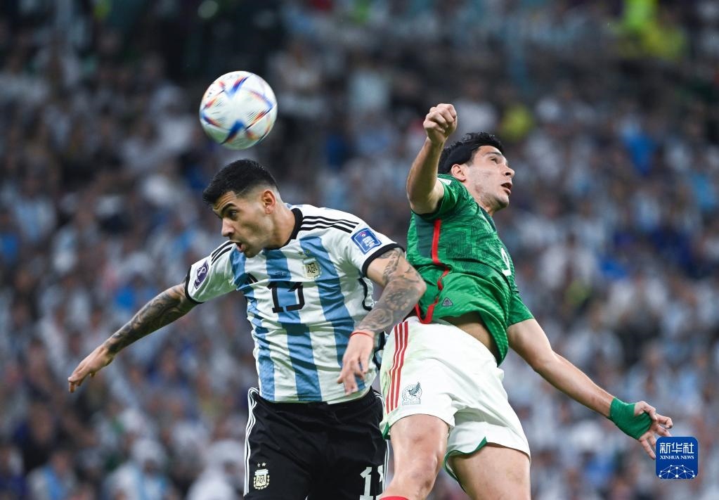 11月26日,阿根廷隊球員克·羅梅羅(左)和墨西哥隊球員勞爾·希門尼斯在比賽中爭頂。新華社記者 李尕 攝