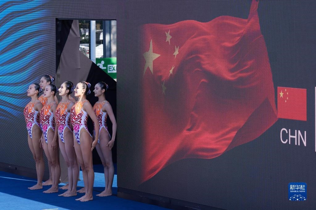 這是2022年6月24日,中國(guó)隊(duì)在游泳世錦賽花樣游泳集體自由自選決賽前入場(chǎng)。新華社記者 孟鼎博 攝