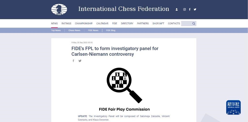 這是國(guó)際棋聯(lián)2022年9月30日在官網(wǎng)公布的關(guān)于作弊風(fēng)波,決定成立調(diào)查小組的新聞頁(yè)面。新華社發(fā)