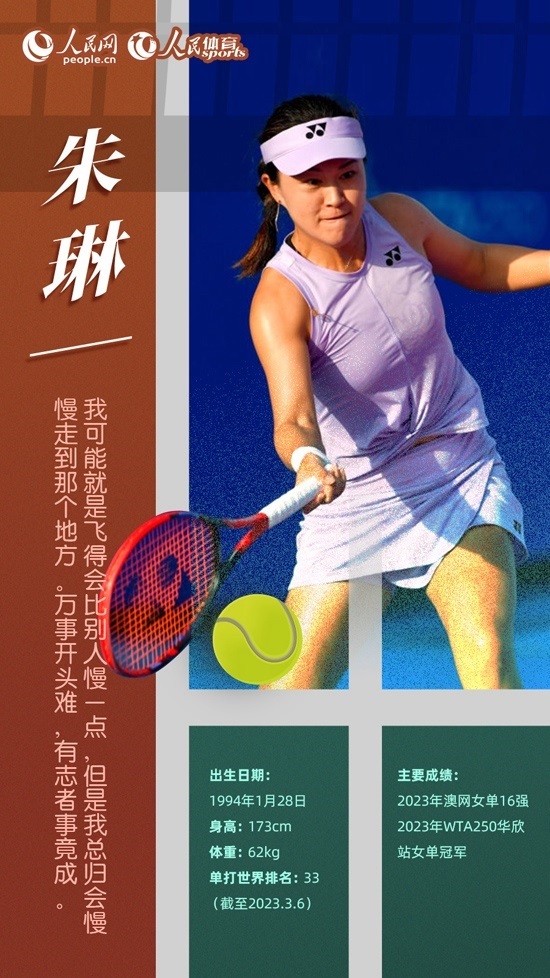 今年年初,29歲的朱琳給自己定了新賽季兩個(gè)目標(biāo):拿一個(gè)WTA巡回賽單打冠軍、世界排名進(jìn)入前50位。朱琳在澳網(wǎng)接連戰(zhàn)勝多位好手,首次闖進(jìn)大滿貫女單16強(qiáng)。2月5日,在WTA華欣站女單決賽中,朱琳戰(zhàn)勝烏克蘭選手特蘇倫科,獲得職業(yè)生涯首個(gè)WTA女單冠軍,同時(shí)世界排名上升至41位,創(chuàng)造個(gè)人最佳成績。僅用了一個(gè)月,她就實(shí)現(xiàn)了年初制定的目標(biāo)。上周,朱琳打進(jìn)WTA250蒙特雷站4強(qiáng),將排名提升至第33位,再創(chuàng)個(gè)人新高。相信在未來的賽場上,“大器晚成”的朱琳還將創(chuàng)造更多的驚喜。