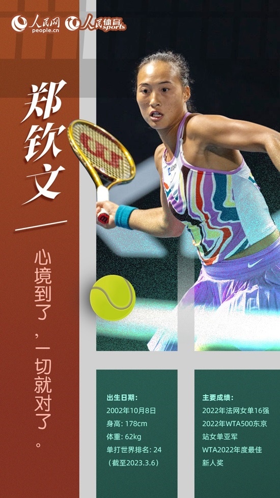 2022年,20歲的鄭欽文為中國女子網(wǎng)壇帶來驚喜。年初,她首次闖入澳網(wǎng)女單正賽并贏得首輪比賽,職業(yè)生涯首次亮相大滿貫正賽就取得開門紅。5月的法網(wǎng),鄭欽文打進(jìn)女單第三輪,成為繼鄭潔、李娜和張帥之后第四位闖入法網(wǎng)16強(qiáng)的中國金花。此后的溫網(wǎng)和美網(wǎng)比賽,她都成功打進(jìn)女單第三輪。