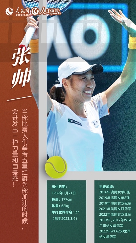 作為現(xiàn)役年齡最大的中國金花,1989年出生的張帥職業(yè)生涯頗為勵(lì)志。2016年,遭遇14次大滿貫“一輪游”后,她終于在澳網(wǎng)收獲正賽首勝,最終成功打進(jìn)女單8強(qiáng)。此后,張帥在2019年溫網(wǎng)中闖入女單8強(qiáng),并奪得2019年澳網(wǎng)女雙冠軍和2021年美網(wǎng)女雙冠軍。2022年7月,她的雙打排名高居世界第二。